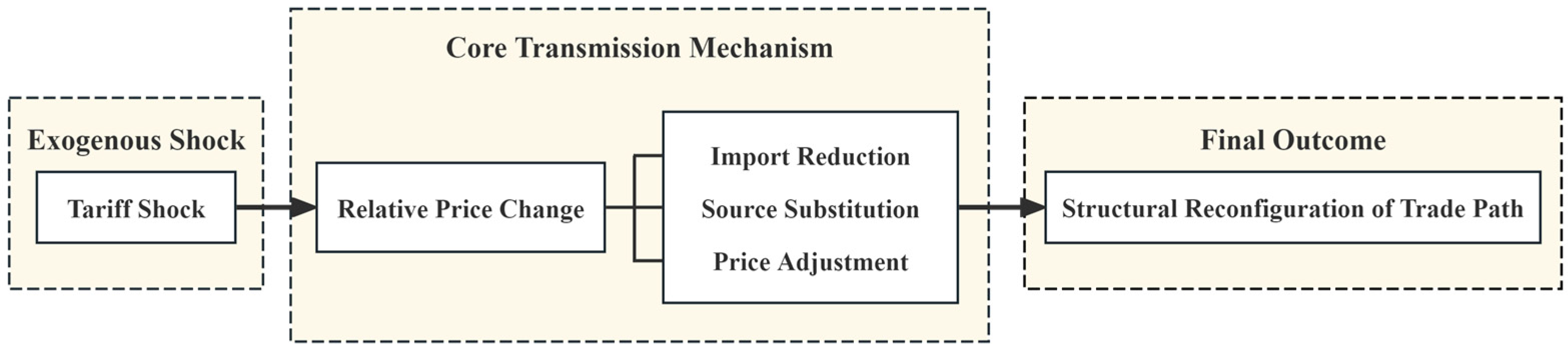 7]. Prior to 2018, China’s soybean imports exhibited a strong dependence on the United States, sustained by stable price competitiveness and established logistical routes. The imposition of retaliatory tariffs disrupted this equilibrium by altering relative prices, thereby dismantling the pre-existing trade path. Building on this conceptual foundation, the study proposes a three-channel analytical framework through which tariff shocks influence agricultural trade. This multi-dimensional mechanism aligns with classical trade adjustment theory [