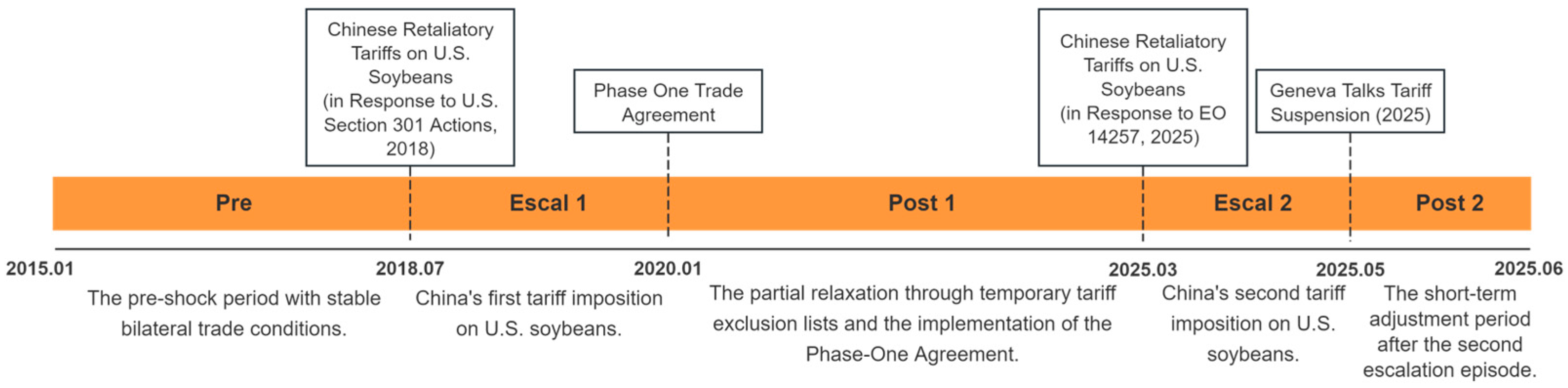To address these gaps, this study employs a novel multi-phase and continuous-intensity DID design. This empirical strategy allows us to quantify the dynamic effects of sequential tariff shocks on China’s soybean import volumes, source-country share reallocation, and asymmetric price pass-through, thereby directly testing the hypotheses derived in the introduction. This approach links macro-level trade interventions to micro-level sourcing and pricing adjustments, providing new evidence on the restructuring of China’s soybean import architecture under recurrent trade shocks and contributing to broader discussions of supply chain resilience and strategic import diversification.