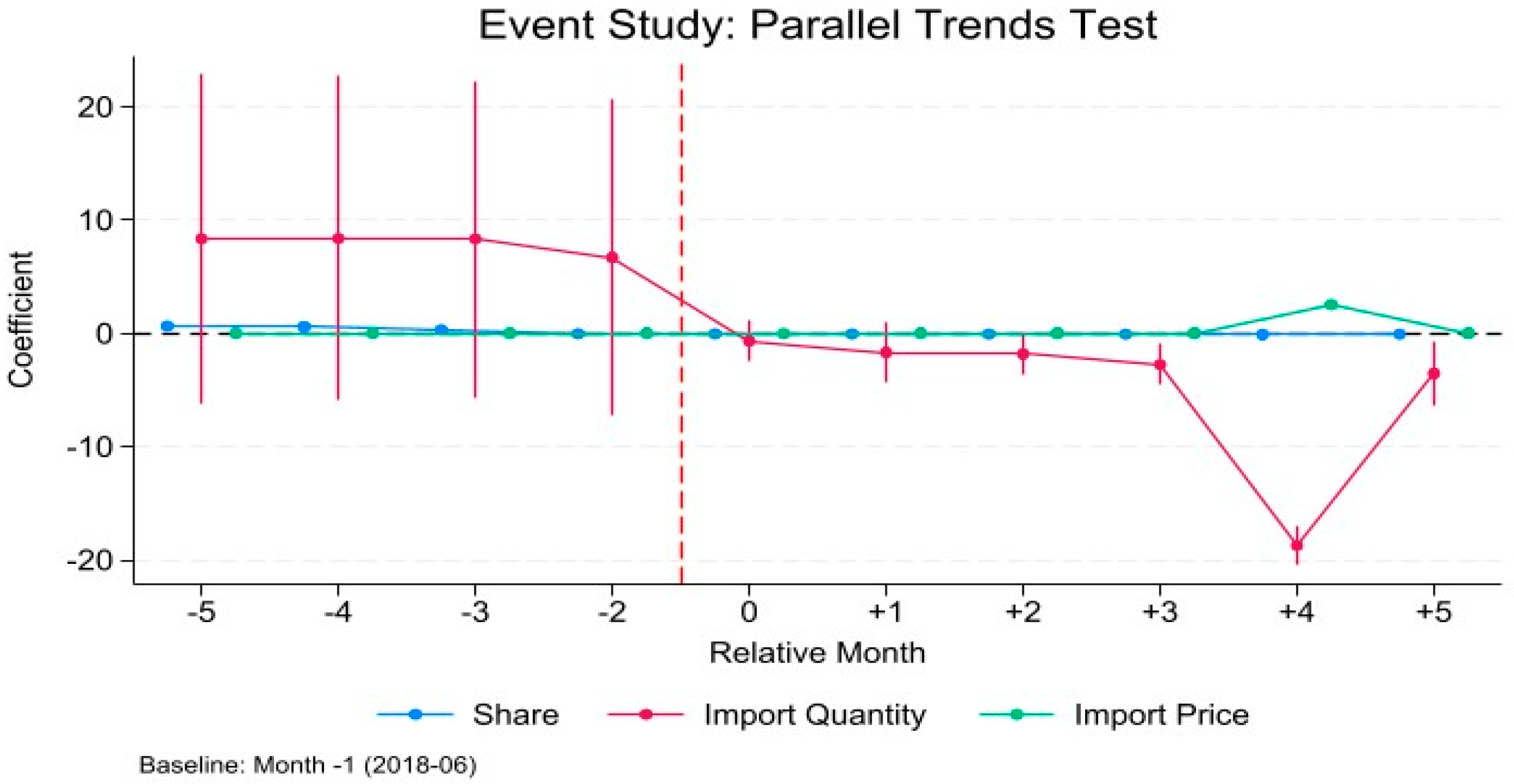 denotes the logarithmic forms of import volume, import share, and import price, respectively. The specification measures outcomes relative to the policy implementation date (July 2018). The period −1 (one period before the policy intervention) is omitted and serves as the baseline group.