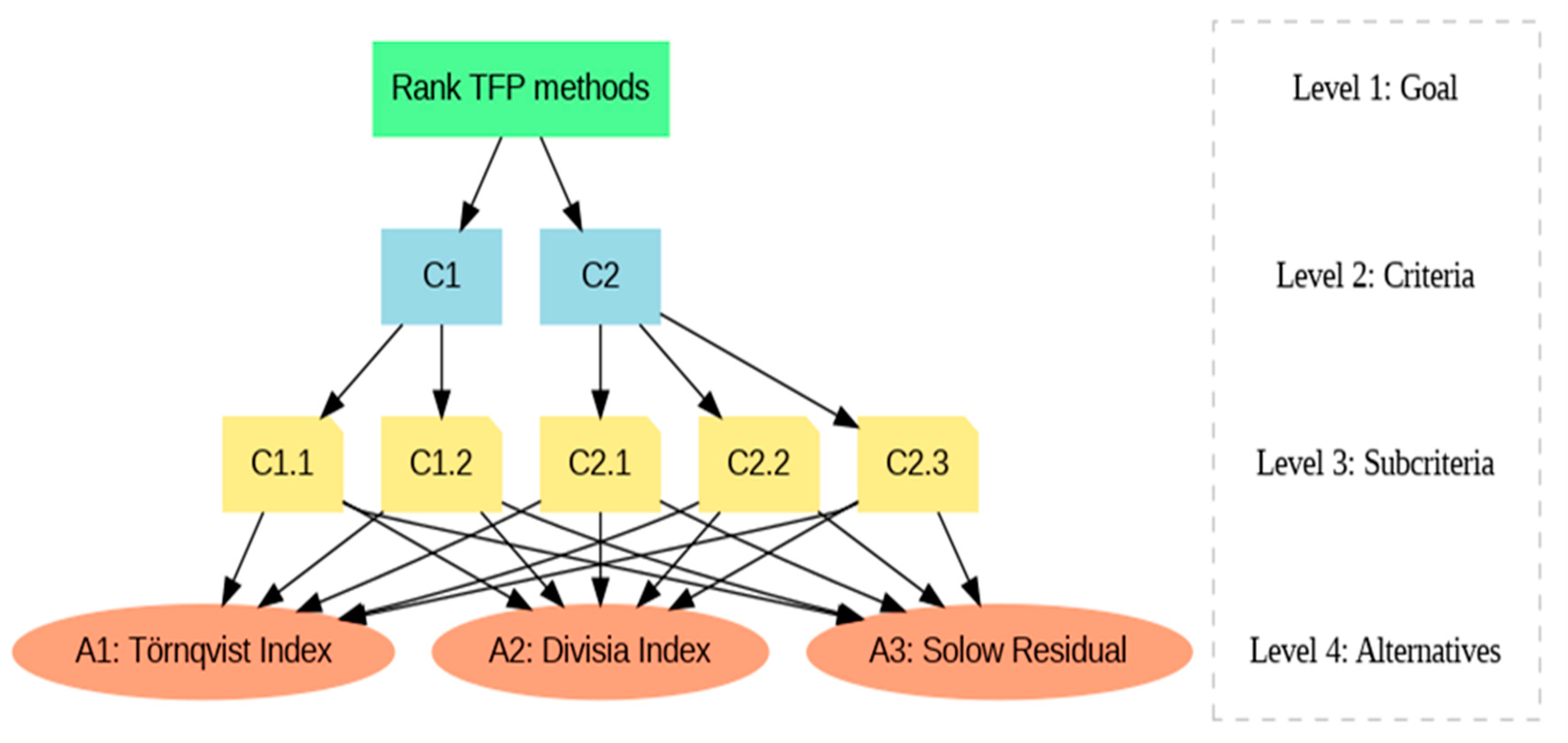 To fill this gap, this paper proposes an adapted framework for institutional policymaking in Tunisia, which applies carefully selected TFP methods to evaluate the sustainability performance of a policymaking institution within AFSC. Rather than introducing a completely new methodology, the study contextualizes and operationalizes existing approaches to enhance their relevance and applicability for decision-makers in data-constrained agricultural institutions. Given the diversity of TFP approaches and the complexity of sustainability issues, decision-support methods such as multi-criteria decision-making (MCDM), with particular attention to the Analytic Hierarchy Process (AHP) [