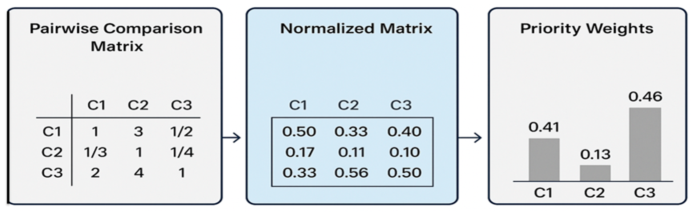 Table A1. Together, these elements demonstrate the internal coherence of the AHP evaluation and the soundness of the derived weights.