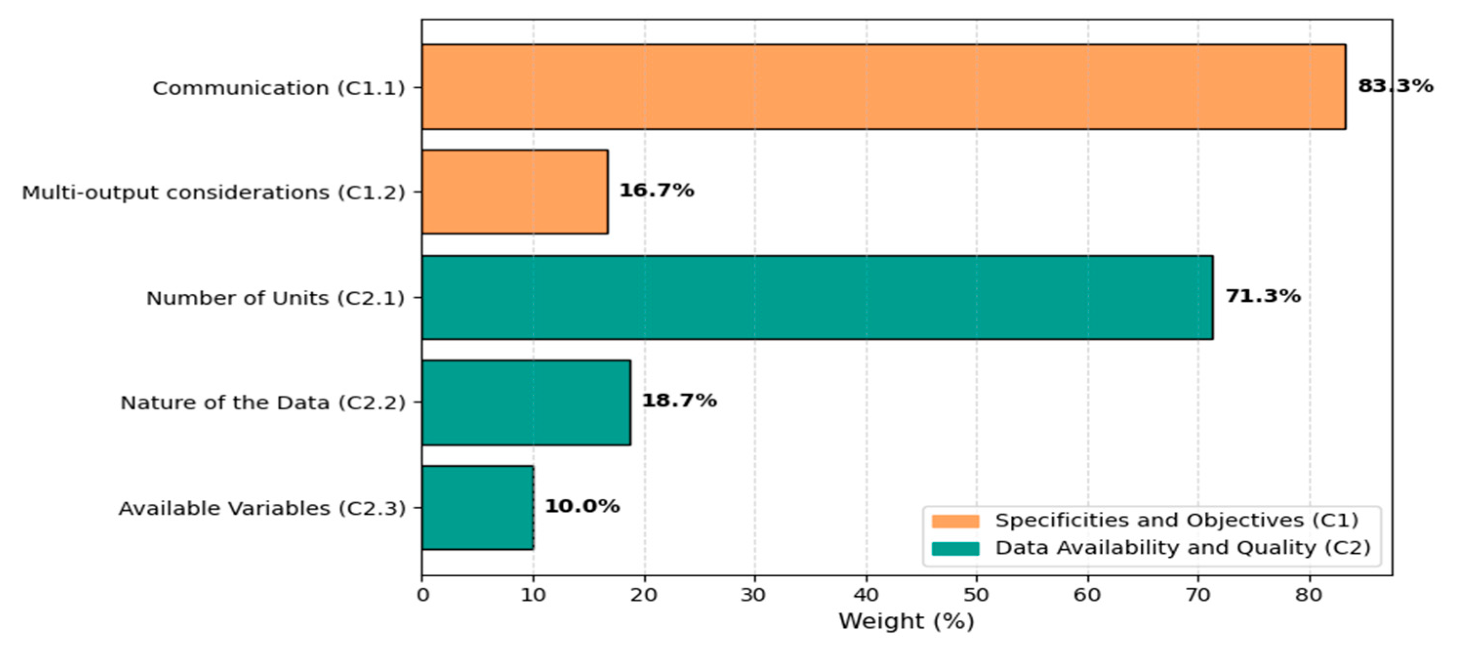 Figure 5. The “Data Availability and Quality (C2)” criterion emerges as the top priority, with a weight of 71.3%, highlighting the central role of data-related aspects in the evaluation process. In contrast, the “Specificities and Objectives (C1)” criterion accounts for 28.7% of the total weight. At the sub-criterion level, within C2, the “Number of Units” sub-criterion is the most influential, followed by the “Nature of the Data” and “Available Variables.” For C1, the “Communication” sub-criterion carries more weight than “Multi-output Considerations.” Overall, these results emphasize the importance of robust and well-structured data, as well as effective communication, in guiding the selection of an appropriate TFP method.