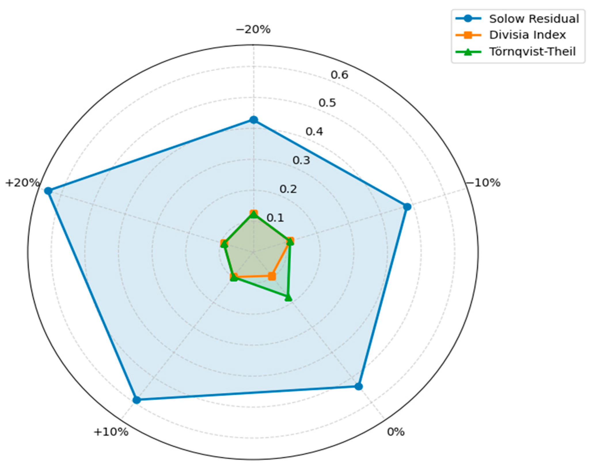 Applying these perturbations, the Divisia Index remained highly stable, the Törnqvist–Theil Index exhibited moderate sensitivity, and the Solow Residual was the most sensitive to changes in criteria weights, confirming the robustness of the ranking obtained from the base-case AHP scores.