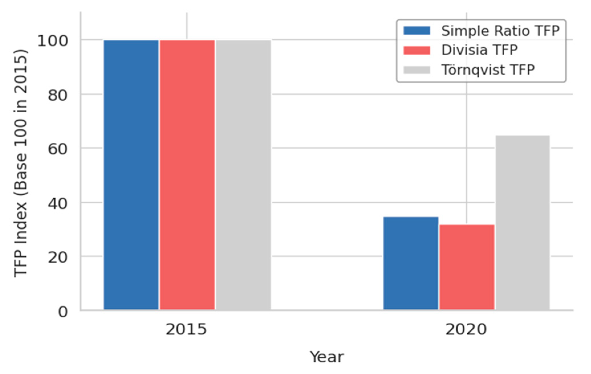 This represents a relative decrease of −23.70%, suggesting that although productivity declined, the magnitude of the reduction varies depending on the index method used. Nevertheless, all three approaches consistently indicate a downward trend in TFP over the five-year period.