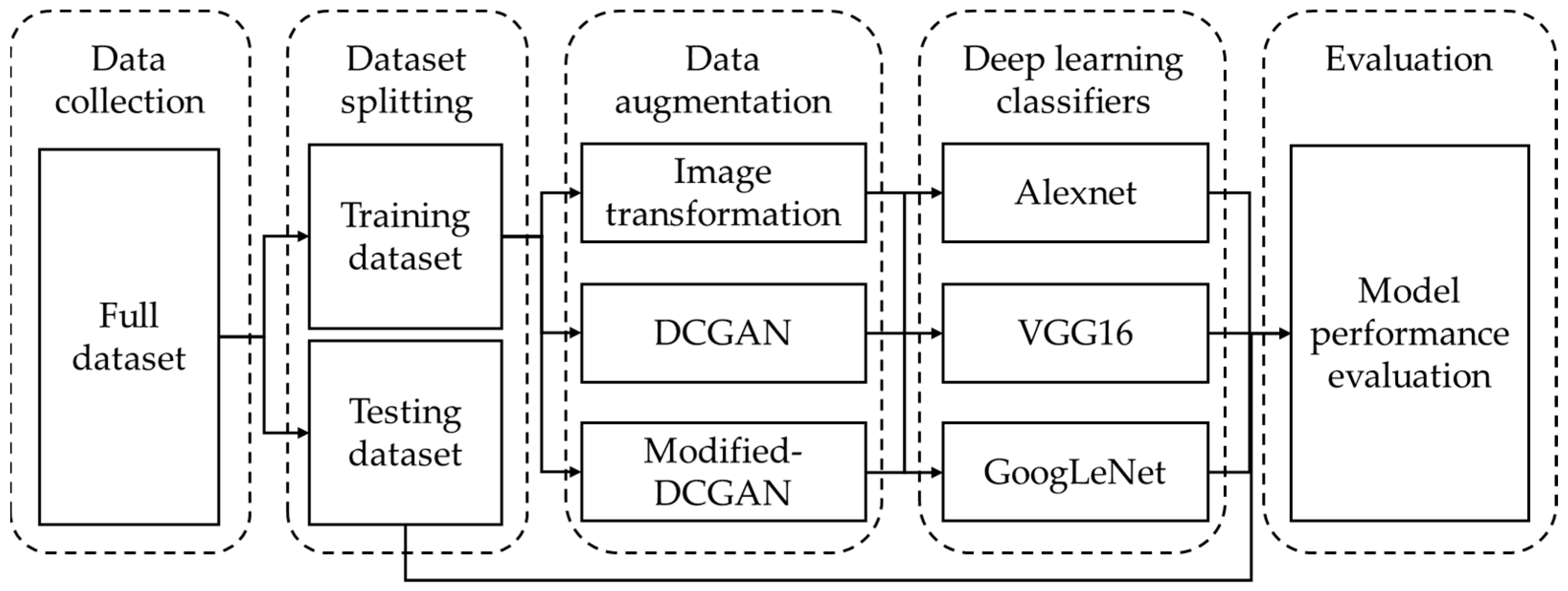 Regarding the classification models under different augmentation scenarios, the classification model performance was compared with precision, recall, F1-score, and accuracy. The modified DCGAN showed an overall better performance for every classification model, where GoogLeNet had the highest classification results for all the augmentation methods, and is, therefore, the best classification model among them all. For augmentation performance comparison on the basis of classification, DCGAN and modified DCGAN perform almost the same, with a slight increment in the performance metrics for modified DCGAN. However, traditional augmentation has less classification performance. The GoogLeNet performed best, and was supported by its fast and efficient training time and moderate parameter size [