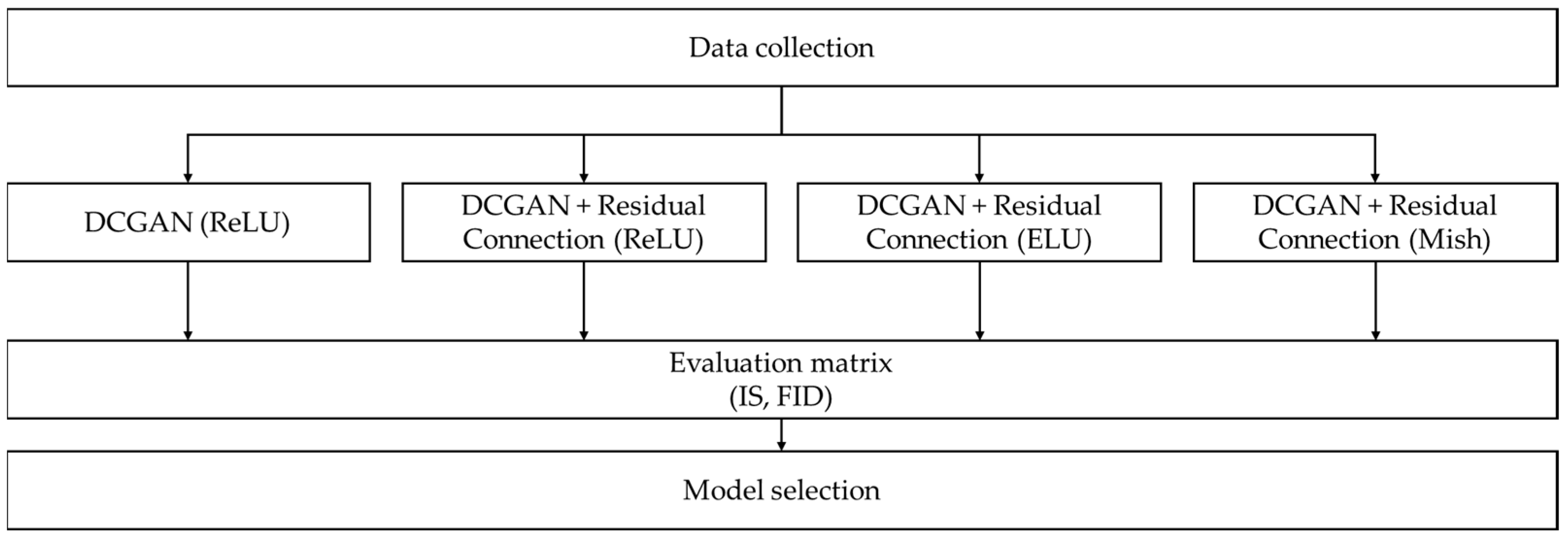 Three types of modified DCGAN were developed using a combination of residual connections with activation functions as follows:
