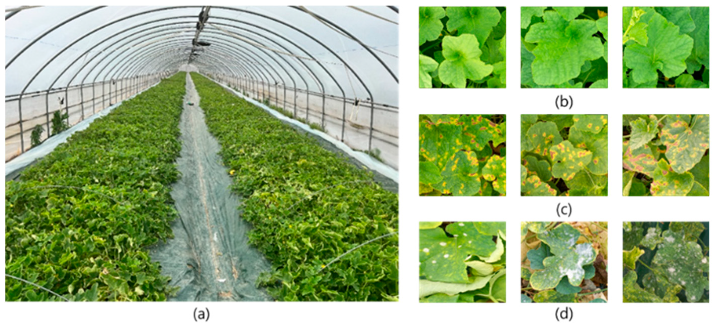 Figure 3) located at 35°57′ N, 128°19′ E (Wolhang-myeon, Seongju-gun, Gyeongsangbuk-do, Republic of Korea). Inside the greenhouse, the average temperature was 29.1 °C, and the humidity was 78.0%. The oriental melon plants were grown without fungicide treatment from June to October 2022. To capture different variations in the leaf disease images, they were obtained on various natural lighting conditions, including morning, afternoon, and evening. The diseases were identified with the guidance of plant cultivation experts. The images were captured using an RGB camera (A32, Samsung electronics, Suwon, Gyeonggi-do, Republic of Korea). A total of 12,000 oriental melon leaf images were collected, comprising 4000 healthy, 4000 downy mildew, and 4000 powdery mildew samples. The dataset was divided into training and test sets at a ratio of 80:20. Data augmentation was applied only to the training set, where an additional 1600 generative images per class were generated using the proposed GAN-based method, corresponding to half of the number of real samples per class.