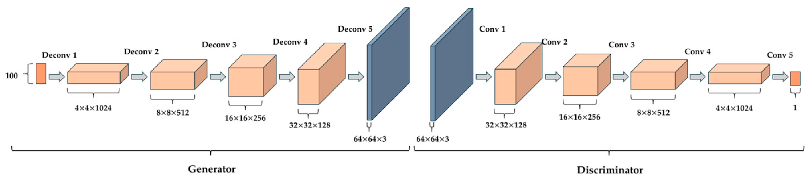 Figure 6). In DCGAN, both the generator and discriminator are constructed using CNN layers. The generator progressively upsamples a latent noise vector using transposed convolution layers to produce a full-resolution image, employing ReLU and tanh as activation functions. The discriminator processes input images through convolutional layers with LeakyReLU activations and outputs a probability indicating whether the image is real or generated. Training in DCGAN follows the standard adversarial framework, alternating between updating the discriminator to classify real and generated images correctly, training the generator to produce realistic images that can fool the discriminator. Due to its convolutional architecture and carefully designed layer configurations, DCGAN has demonstrated success in generating diverse and high-quality images across a wide range of domains.