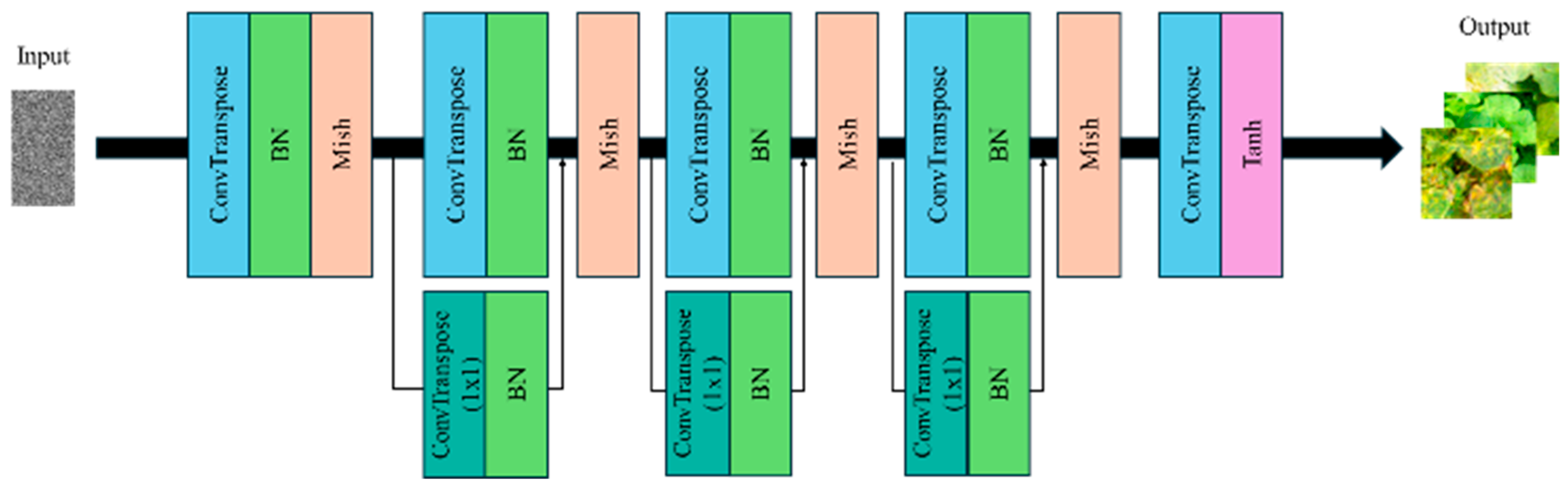 This lightweight residual mechanism does not alter the overall depth or structure of DCGAN but enables smoother training and improves the stability of the image generation process. Ultimately, this modification aims to enhance the quality and diversity of the synthesized plant disease images without increasing architectural complexity. Accordingly,