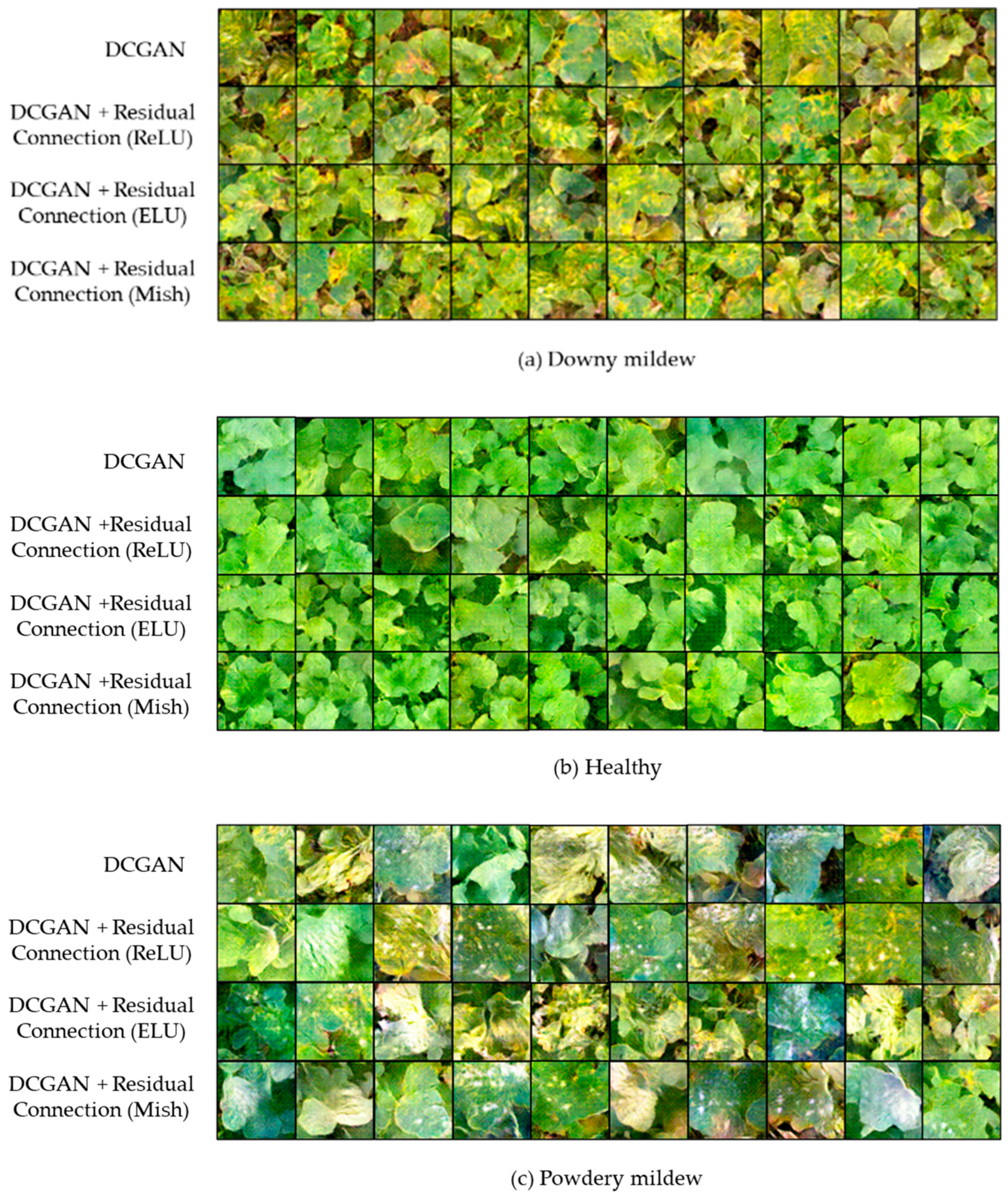 Table 1, the IS results demonstrated considerable differences among model configurations for generating different disease images. The DCGAN achieved IS values of 1.56 for downy mildew, 1.77 for healthy leaves, and 2.31 for powdery mildew, whereas with residual connections and ReLU being added, the IS values improved to 1.60, 1.76, and 2.36, respectively, showing improvement. Further improvement was observed in the DCGAN model when residual connections and ELU were applied, with the highest gain observed in the powdery mildew. Finally, the model that combined residual connections and the Mish function showed the highest IS values for all classes, suggesting an improvement in the % value for classes with respect to conventional DCGAN. These results indicate that models with residual connections and Mish improved the clarity and diversity of different disease classes of generative images.