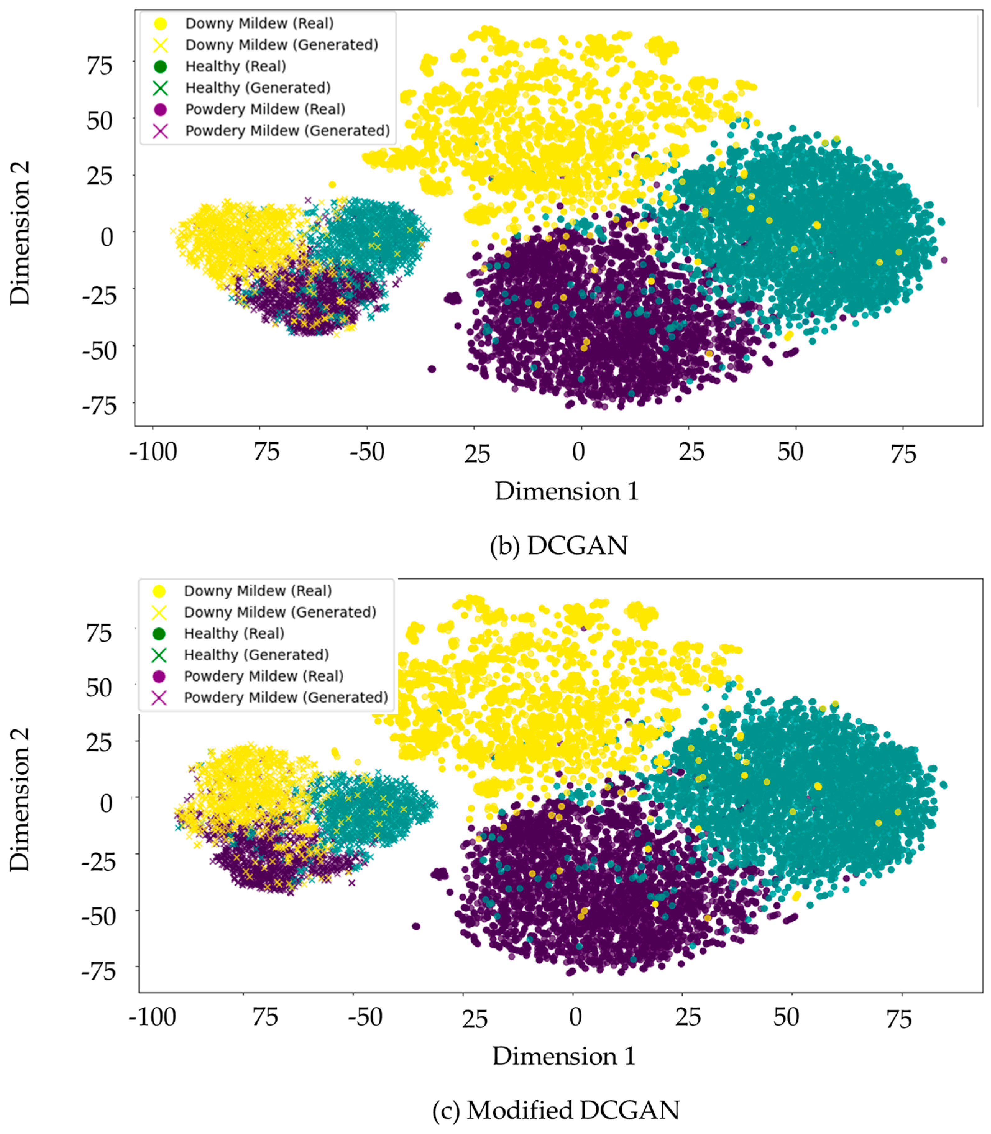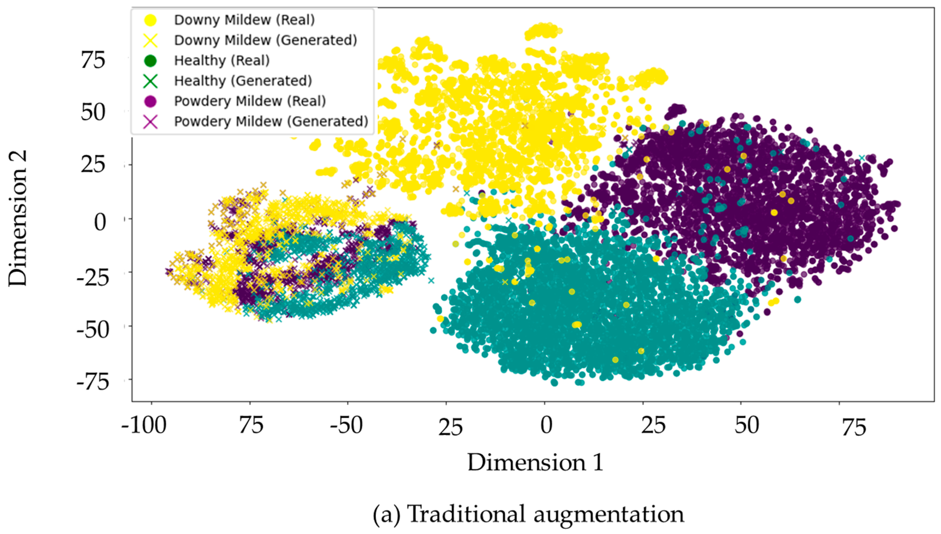 Figure 10a), generative images and various classes of images, including downy mildew, healthy leaves, and powdery mildew, seem to overlap in feature space with unknown distinction compared to the real images. Particularly, the generative image for the powdery mildew class showed significant overlap with the healthy class. This indicates that traditional augmentation was not sufficient to preserve class-specific characteristics and different feature spaces between the overlapping disease and healthy classes. The resulting clusters were less distinct, and class boundaries were poorly defined.