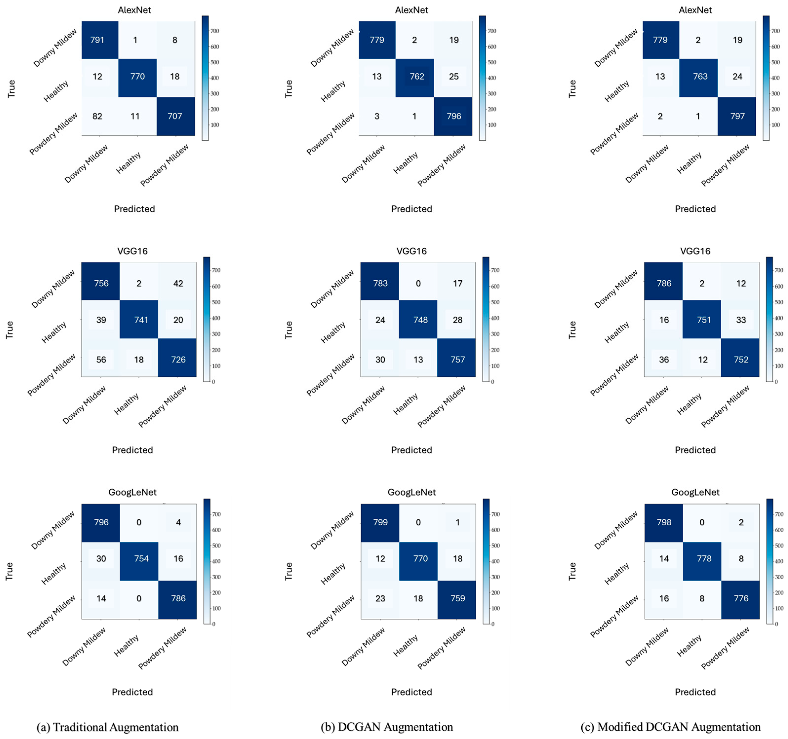 Figure 11a, for the AlexNet model with different augmentation methods, the traditional augmentation performed well for the downy mildew and healthy classes; however, it showed the poorest performance for the powdery mildew class. In contrast, both the DCGAN and modified DCGAN methods achieved superior classification for powdery mildew, with fewer than three misclassifications. Furthermore, for