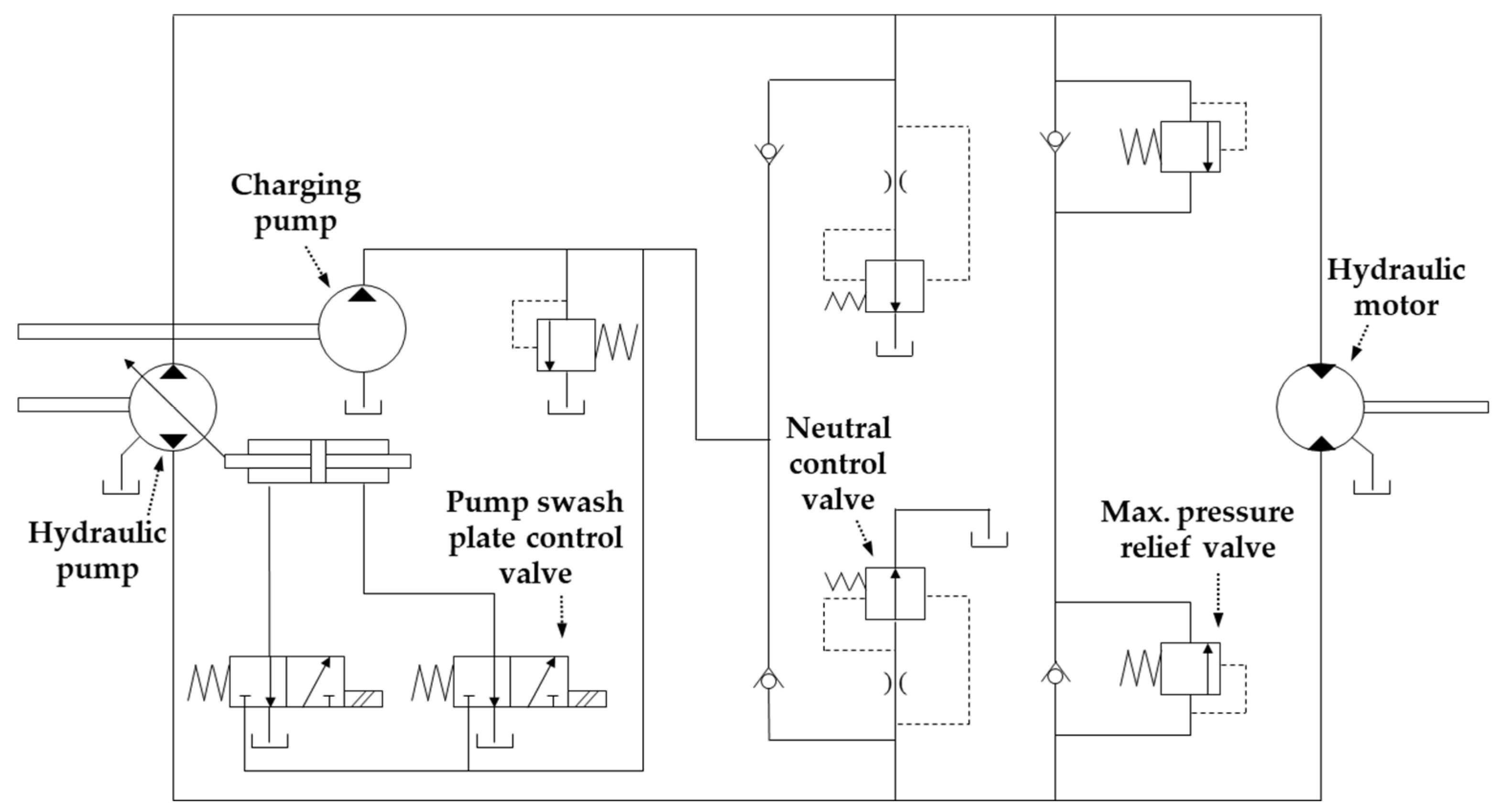 - Ho, T.H.; Ahn, K.K. Modeling and simulation of hydrostatic transmission system with energy regeneration using hydraulic accumulator. J. Mech. Sci. Technol. 2010, 24, 1163–1175. [Google Scholar] [CrossRef]