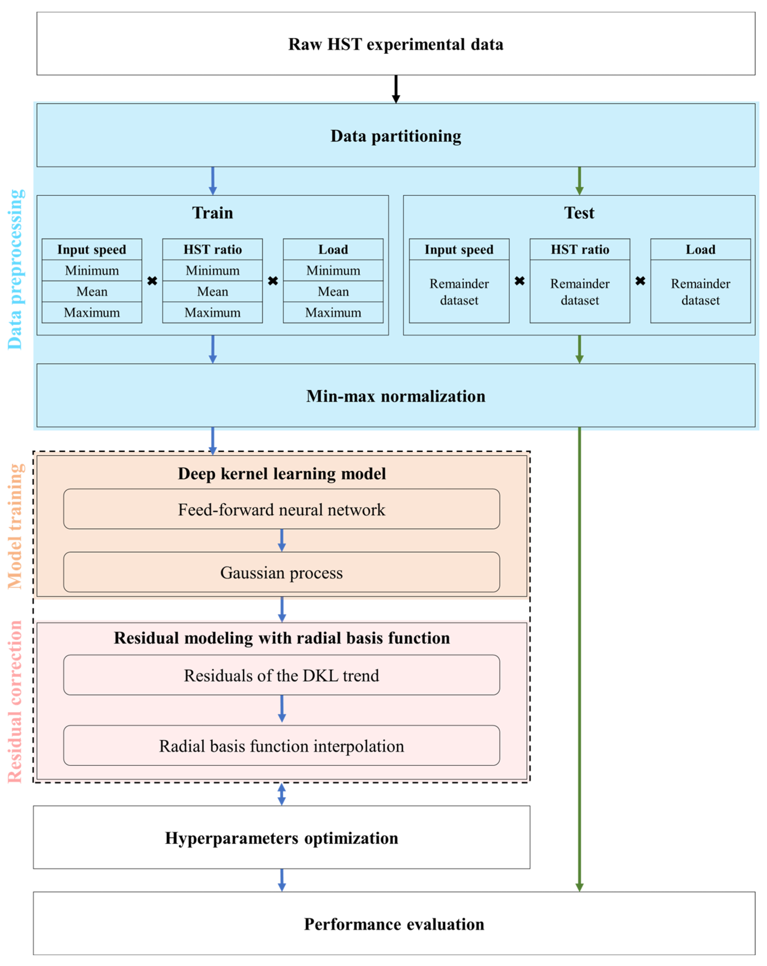 - A prediction model was developed for accurate HST efficiency estimation using 27 sets of experimental data. The model was constructed based on DKL, which is advantageous for prediction with limited datasets, and was further enhanced by integrating a residual RBF interpolator for error correction.