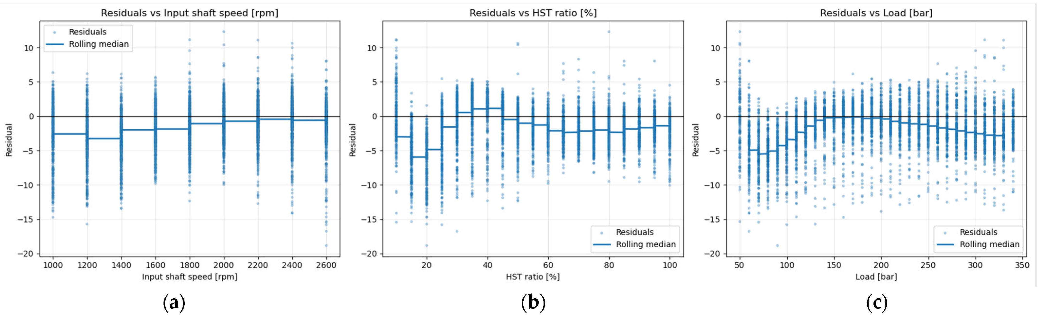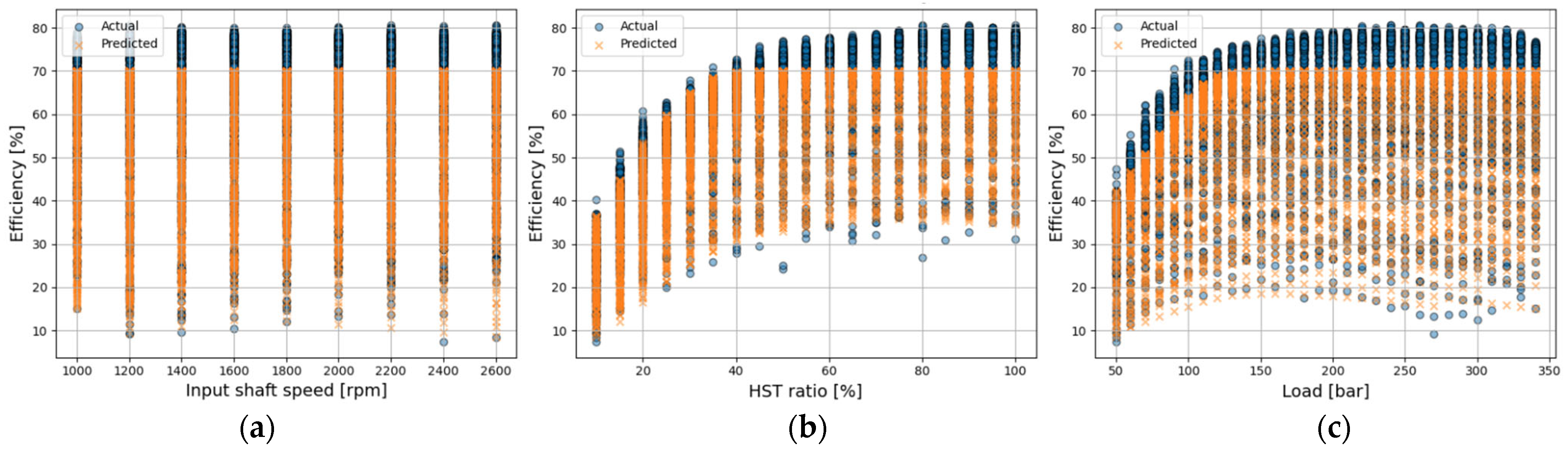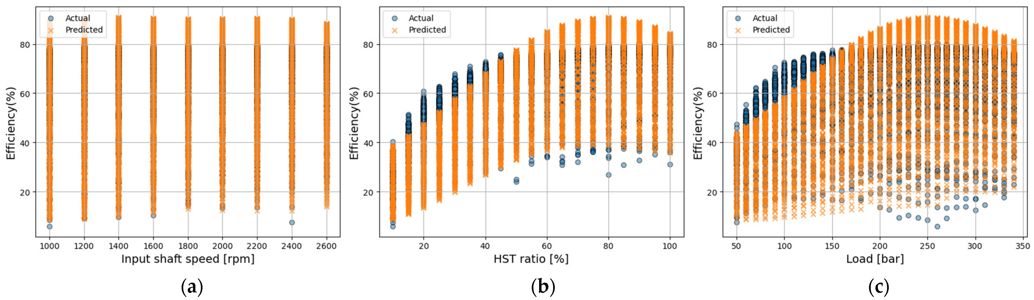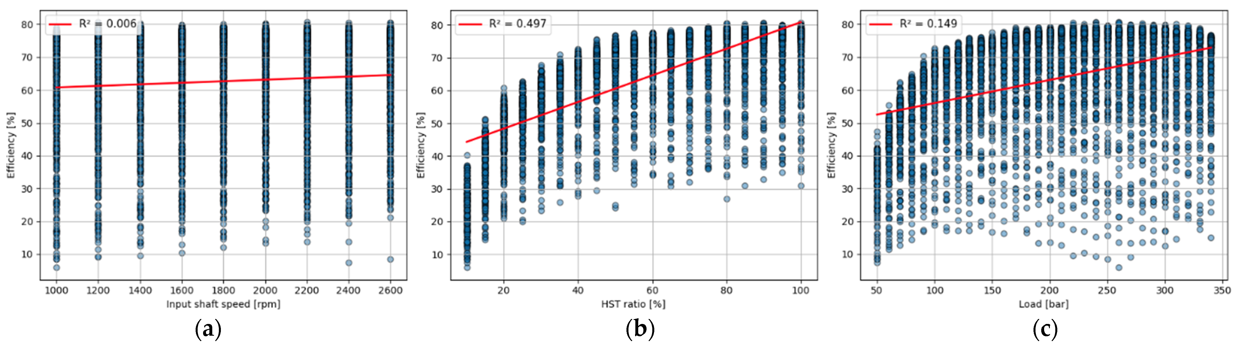 - For model training, the input datasets were constructed using the maximum, minimum, and mean values of the input variables. The input variables are the input shaft speed, HST ratio, and load, and the output variable is the overall efficiency.