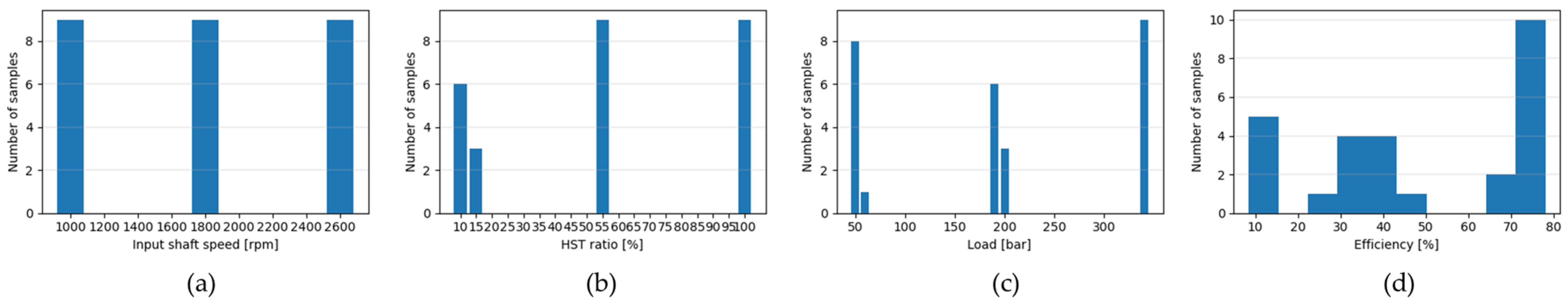 - A minimal dataset was constructed by extracting samples, specifically the maximum, minimum, and mean values of each input variable (input shaft speed, HST ratio, and load). Consequently, 27 data points were selected from a full set of 5092 experimental samples.