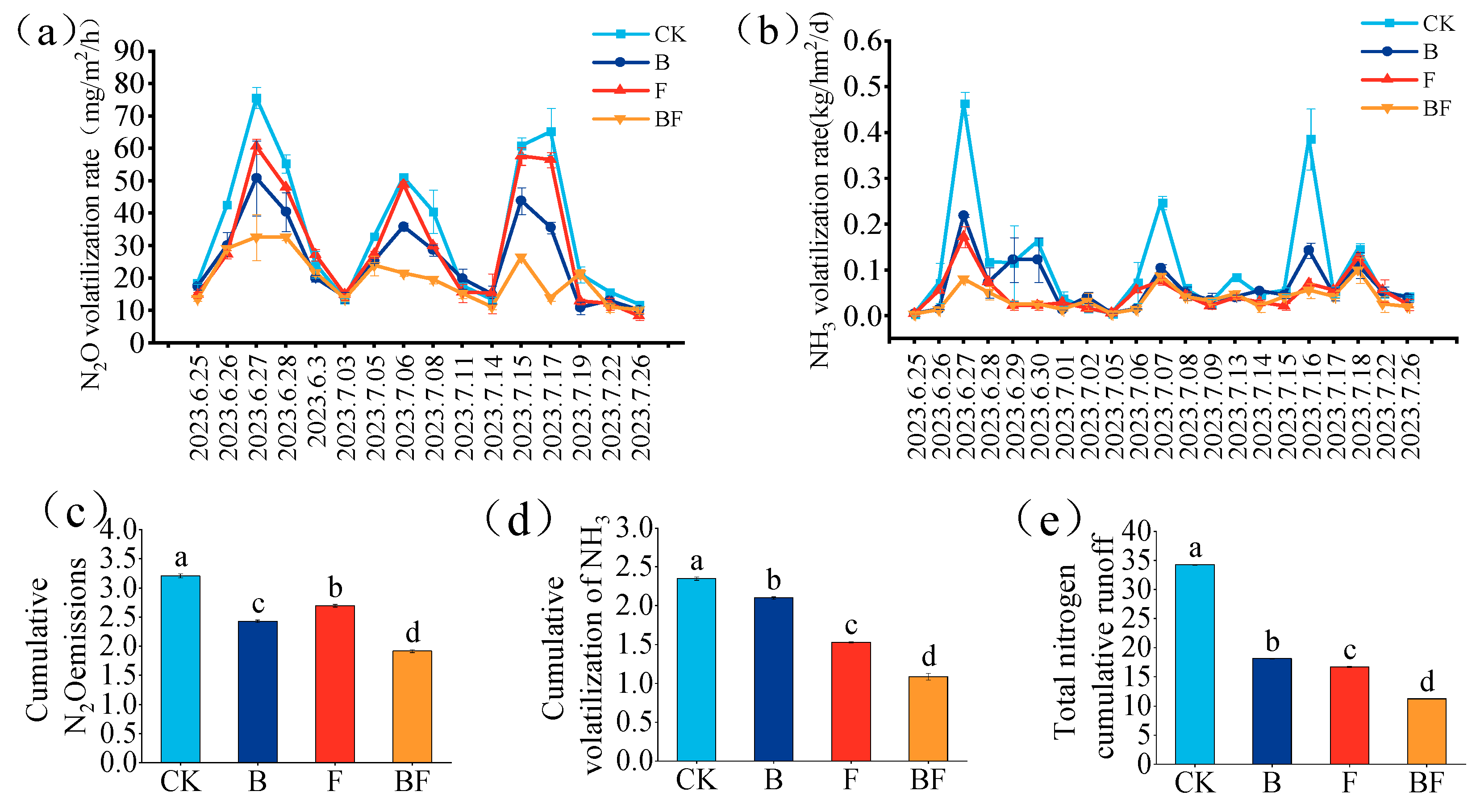 The figure illustrates the characteristics of N2O emissions and NH3 volatilization based on cultivation experiment data from the sixth crop (Figure 1). Application of biochar and organic fertilizer led to a significant reduction in gaseous and runoff nitrogen losses. Specifically, compared to the control (CK), treatments involving biochar (B), organic fertilizer (F), and their combination (BF) reduced runoff losses by 47.07%, 51.21%, and 67.20%, respectively. Organic fertilizer outperformed biochar in mitigating nitrogen runoff losses. Furthermore, all treatments, in comparison to the CK treatment, notably decreased cumulative N2O emissions and NH3 volatilization, as well as their emission and volatilization rates. While all treatments did not affect the peak timing of N2O emission and NH3 volatilization rates significantly, the reduction in emissions and volatilization was primarily achieved by delaying the peak timing. Specifically, the F treatment surpassed the B treatment in reducing NH3 volatilization rate and cumulative emissions, whereas the B treatment outperformed the F treatment in reducing N2O emission rate and cumulative emissions. The BF treatment demonstrated the most effective reduction in N2O and NH3 emission rates and cumulative emissions (Figure 1a–e). These findings suggest that the application of biochar and organic fertilizer can effectively decrease N2O and NH3 emission fluxes.