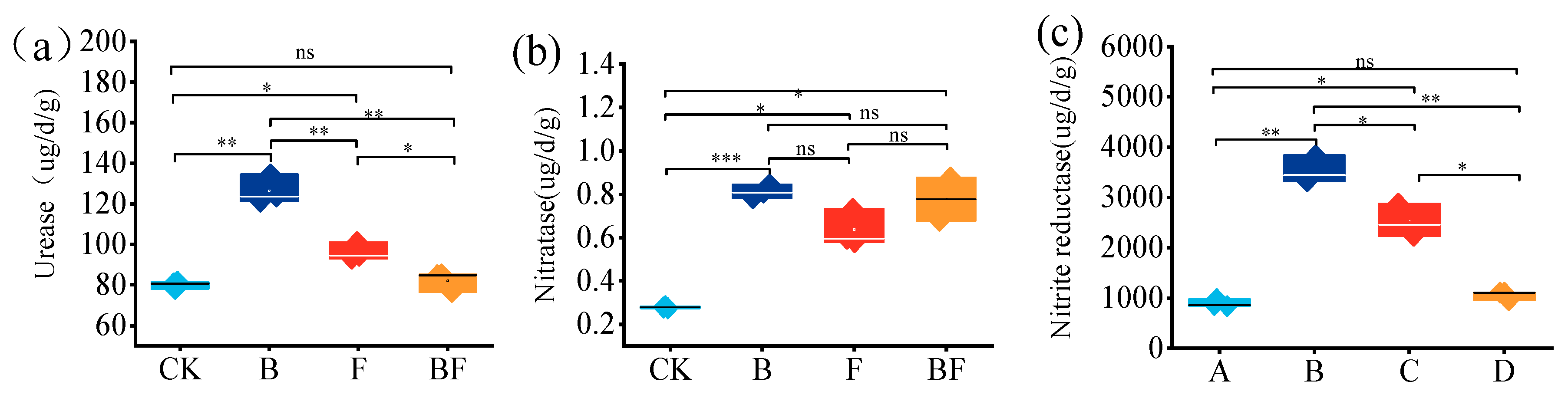 Depicted in the figure, both B and F treatments exhibit elevated levels of soil urease, nitrate reductase, and nitrite reductase activities compared to the control group (CK). Notably, the enhancement of urease, nitrate reductase, and nitrite reductase activities is more pronounced in the B treatment than in the F treatment. Specifically, the combined treatment of urease and nitrite reductase in the BF group did not demonstrate a statistically significant difference compared to the CK group (p > 0.05), whereas a significant increase in nitrate reductase activity was observed (Figure 2a–c).