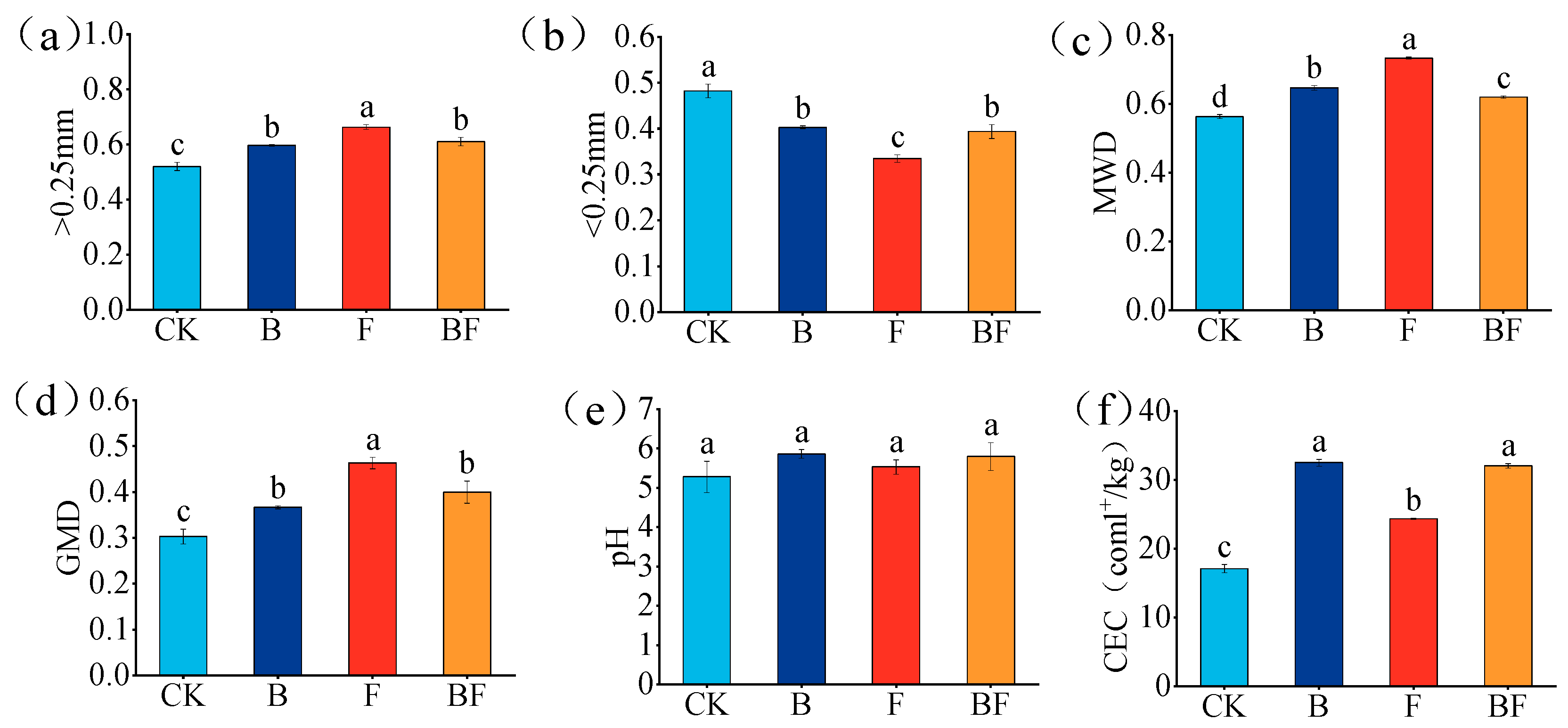 The figure demonstrates that the use of biochar and organic fertilizer led to a notable increase in soil aggregates >0.25 mm compared to CK. The decrease was by 0.05. Moreover, the CEC values of B, F, and BF treatments exhibited significant increases of 89.90%, 42.39%, and 87.27%, respectively (Figure 3a–f). This indicates that biochar has a higher capacity for soil nutrient adsorption than organic fertilizer and can elevate soil pH levels to a certain degree.