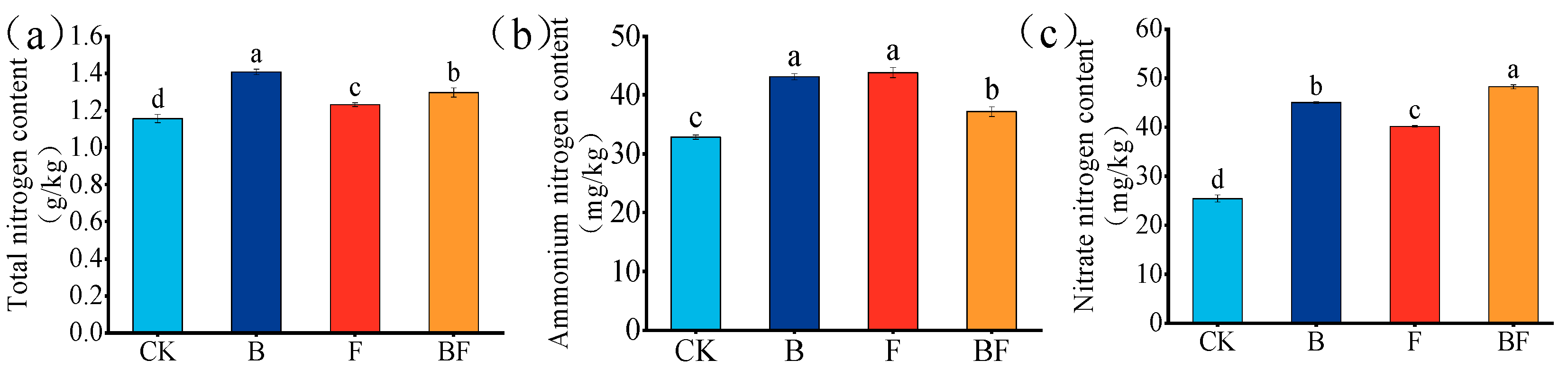 As shown in the figure, after the application of biochar and organic fertilizer, each treatment significantly increased the soil total nitrogen by 21.79%, 6.46% and 12.11%, respectively, compared with the control. The ammonium nitrogen increased by 31.21%, 33.40% and 13.21%, respectively, and the nitrate nitrogen content increased by 77.18%, 58.12% and 89.82%, respectively (Figure 4a–c). The effect of improving soil total nitrogen and nitrate nitrogen was better than that of F treatment. There was no significant difference in ammonium nitrogen content between the two treatments. The total nitrogen content of BF treatment was between B treatment and F treatment, and the ammonium nitrogen content was significantly lower than that of B treatment and F treatment. The content of nitrate nitrogen was significantly higher than that of each treatment.