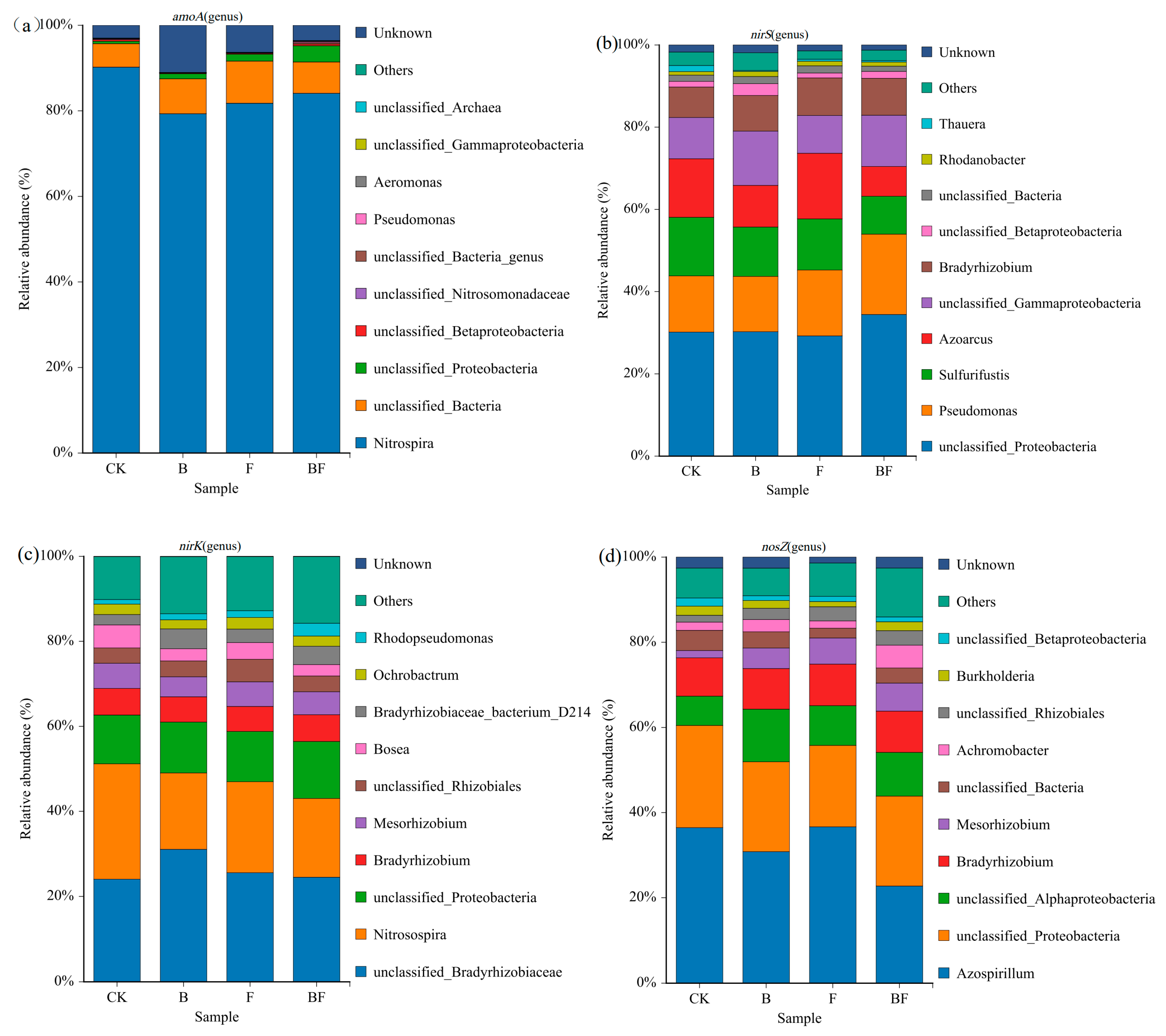 Through the analysis of nitrogen conversion microbial communities in different treatments, for α-diversity, we calculated both the Shannon and Chao1 indices. The significant differences observed among treatments were formally tested using one-way ANOVA, with the results detailed in Supplementary Figure S1a–l. For β-diversity: We performed Non-metric Multidimensional Scaling (NMDS) based on Bray–Curtis distances to visualize the community composition differences. The excellent reliability of the NMDS ordination is confirmed by a stress value of less than 0.05 for all analyses, indicating a high-fidelity representation of the underlying data. The statistical significance of the observed separation between treatment groups was further validated using ANOSIM (Analysis of Similarities). it was found that there were significant differences in α diversity and β diversity among nitrogen conversion microbial communities in different treatments (Figure S1a–l). The relative abundance of soil nitrogen-converting microorganisms after the application of biochar and organic fertilizer was compared at the subordinate level, respectively. Community composition analysis was performed at the genus level It was found that there were differences in the community composition, as shown in Figure 5a. The top 10 genera of each treatment for amoA were Nitrospira, Betaproteobacteria, Nitrosomonadaceae, Pseudomonas, Aeromonas, Gammaproteobacteria and Archaea, as shown in Figure 5b. The top 10 genera for each nirS treatment were Pseudomonas, Sulfurifustis, Azoarcus, Gammaproteobacteria, Bradyrhizobium, Betaproteobacteria, Rhodanobacter and Thauera, as shown in Figure 5c The top 10 genera of bacteria treated with nirK were Bradyrhizobiaceae, Nitrosospira, Bradyrhizobium, Mesorhizobium, Rhizobiales, Bosea, Bradyrhizobiaceae, and Ochrobactrum and Rhodopseudomonas, as shown in Figure 5d, The top 10 genera of each treated nosZ were Azospirillum, Alphaproteobacteria, Bradyrhizobium, Mesorhizobium, Achromobacter, Rhizobiales, Burkholderia and Betap roteobacteria. To further analyze the differential microorganisms among different treatments, we adopted LEfSe (LDA > 4) analysis at the genus level to identify the differential microorganisms. LDA score (log10) > 4.0 corresponds to an effect size that highlights taxa with substantial and biologically meaningful differences in abundance between groups. Among them, there were no significantly different microorganisms between amoA-type nitrifying microorganisms and nosZ-type denitrifying microorganisms at this threshold, while there were three differential microorganisms between nirS- and nirK-type denitrifying microorganisms, Azoarcus, Natrialbaceae, Vogesella (Figure S2a–c) and Afipia, bacterium_enrichment_culture_clone_B_MYnirK1 (Figure S2d,e), respectively. Treatment F significantly enriched Azoarcus and Afipia compared with treatment B, and treatment B significantly enriched Natrialbaceae, Vogesella and bacterium_enrichment_culture_clone_B_MYnirK1 compared with treatment F. It is indicated that the application of biochar and organic fertilizer changed the groups of nirS and nirK nitrogen-converting microorganisms, which might be an important reason for the inconsistency between N2O emissions and NH3 volatilization.