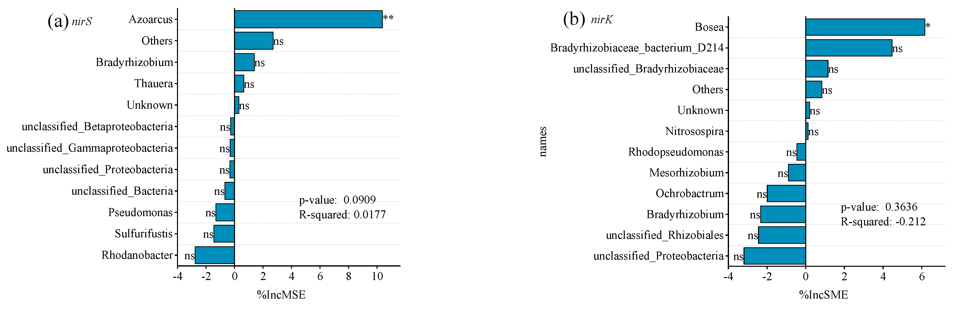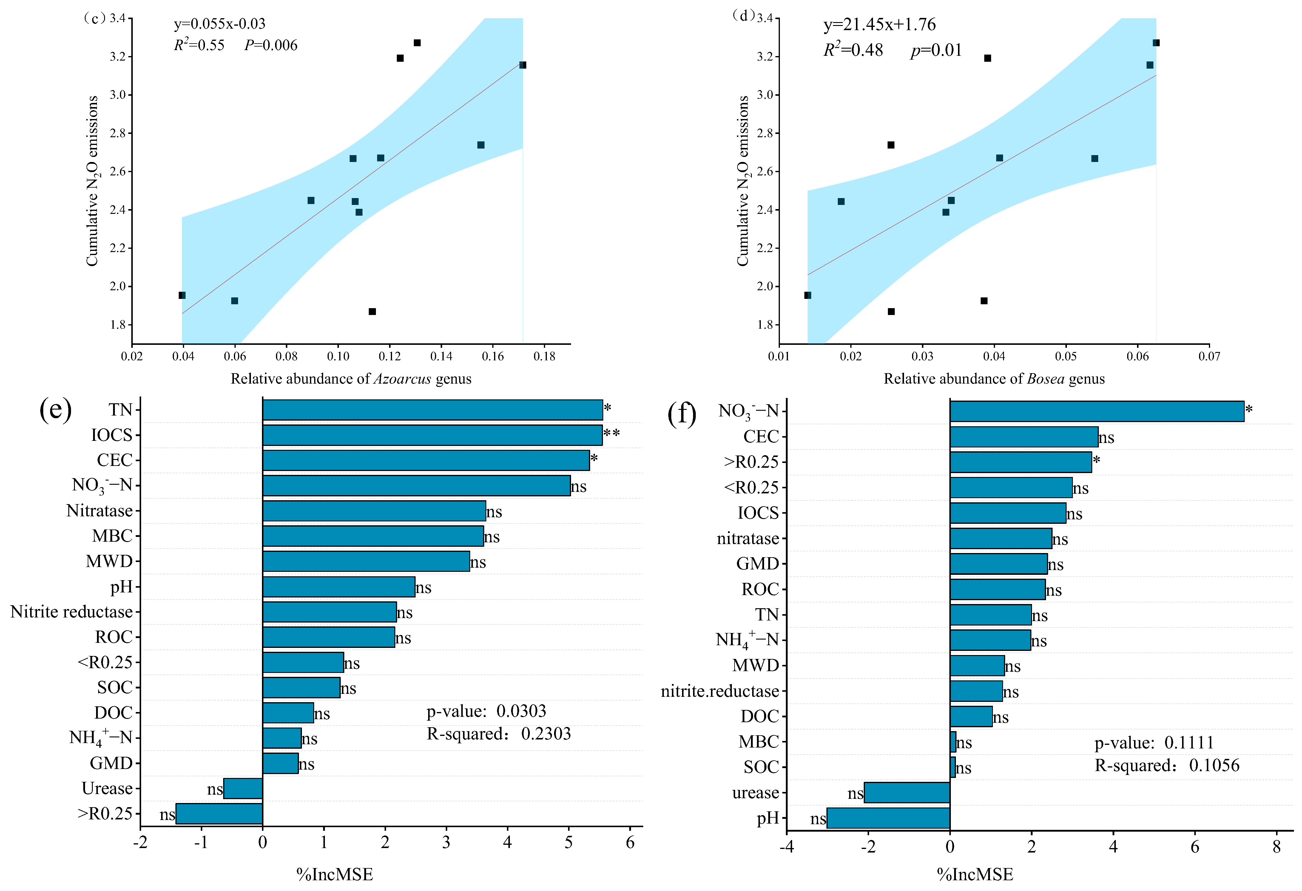 Figure 7. Analysis of soil nitrogen-transforming microbial communities and key predictors of N2O emissions. (a) N2O excretion by nirS microorganisms random forest analysis without influence (b) random forest analysis of the impact of nirK genus microorganisms on N2O emissions; (c) Linear regression analysis of nirS-type key microorganisms and N2O emissions; (d) Linear regression analysis of nirK-type key microorganisms and N2O emissions. (e) Random forest analysis of soil physicochemical properties on nirS-type key microorganisms; (f) random forest analysis of soil physicochemical properties on key microorganisms of nirK type. In random forest analysis, In linear regression analysis, the blue shaded portion represents a 95% confidence interval. In random forest analysis, “**” indicates significant feature importance (p < 0.01), “*” indicates significant feature importance (p < 0.05), while “ns” is not significant (p ≥ 0.05).