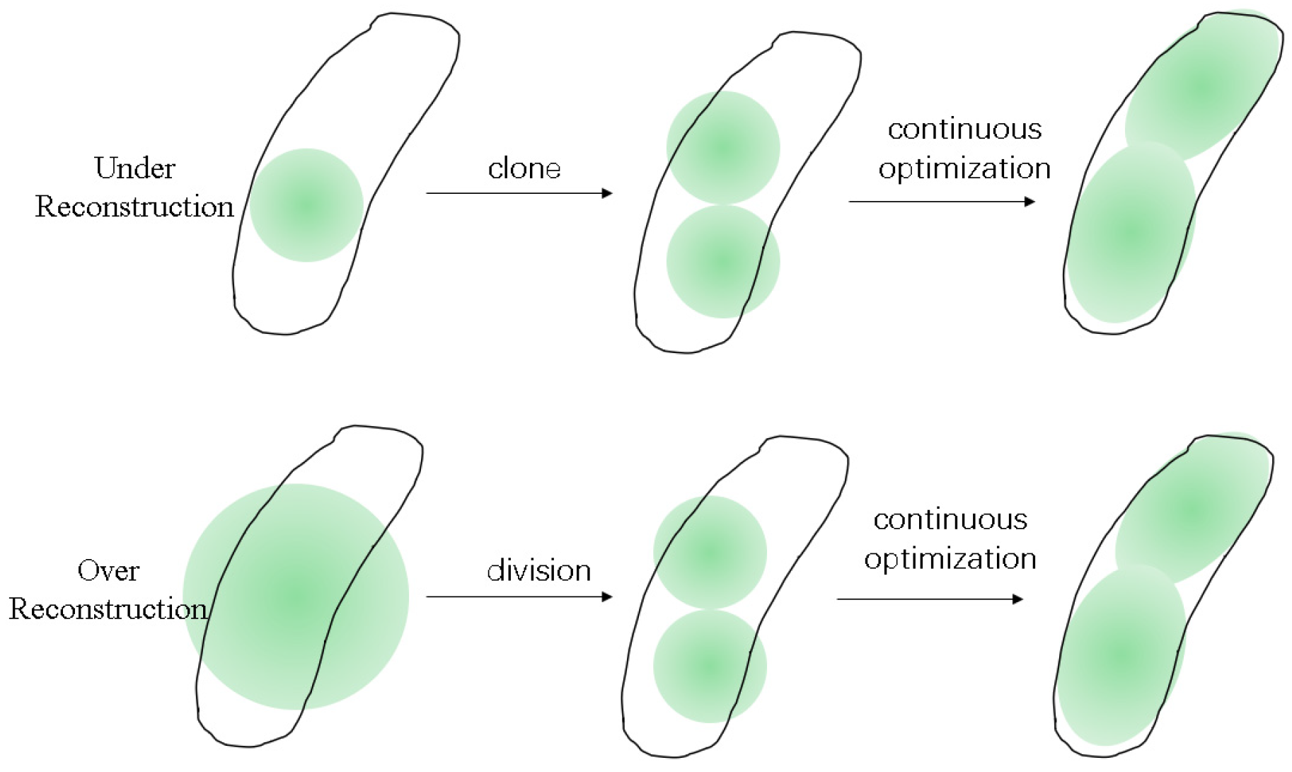- Under-Reconstruction: The existing 3D Gaussian primitives are insufficient to cover the areas that need reconstruction. The solution involves cloning the existing primitives to expand their coverage, ensuring they accurately reconstruct all necessary regions.