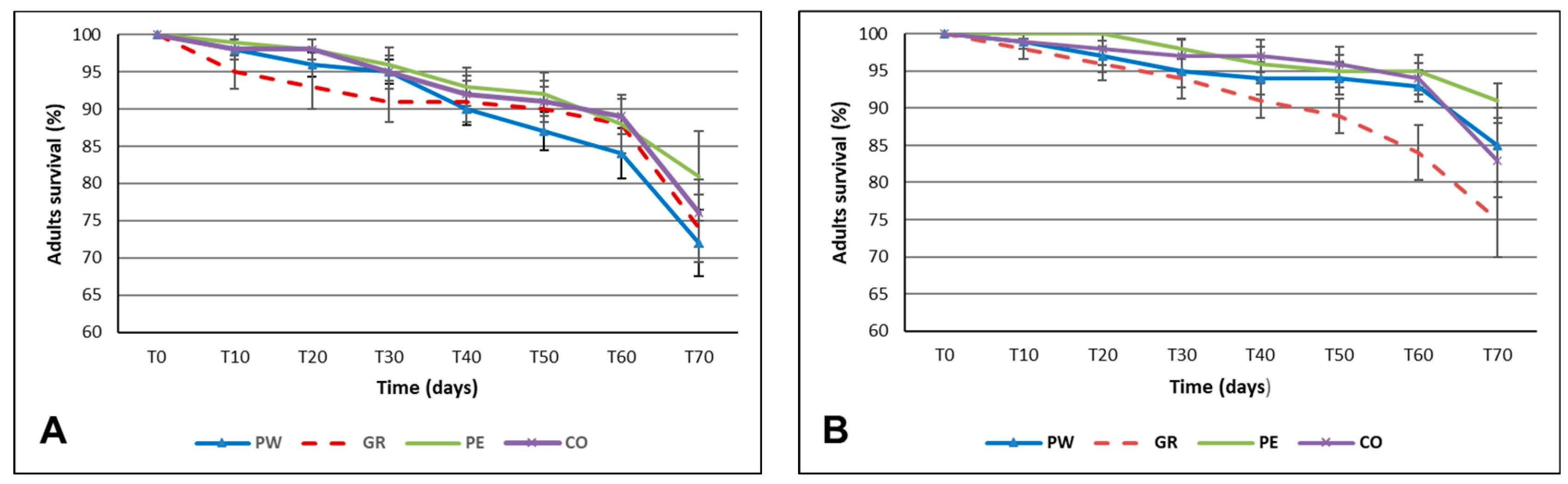 After 30–70 days from oviposition, the different wheat bran feed forms did not affect larval survival or weight gain, except for the lower performance observed with the feed assembled in “cookie” form. In brewer’s spent grain, survival was unaffected, while larval weight was lower in both assembled forms up to day 50. Subsequently, the results showed a different growth pattern: larvae were lighter in PW and CO than in GR (control), while the weight of those fed PE was not significantly different from that of those fed GR (at day 70). This change in performance between powdered and pelleted feeds was also confirmed by the weight recovery of larvae fed with crumbled chicken feed between the 60