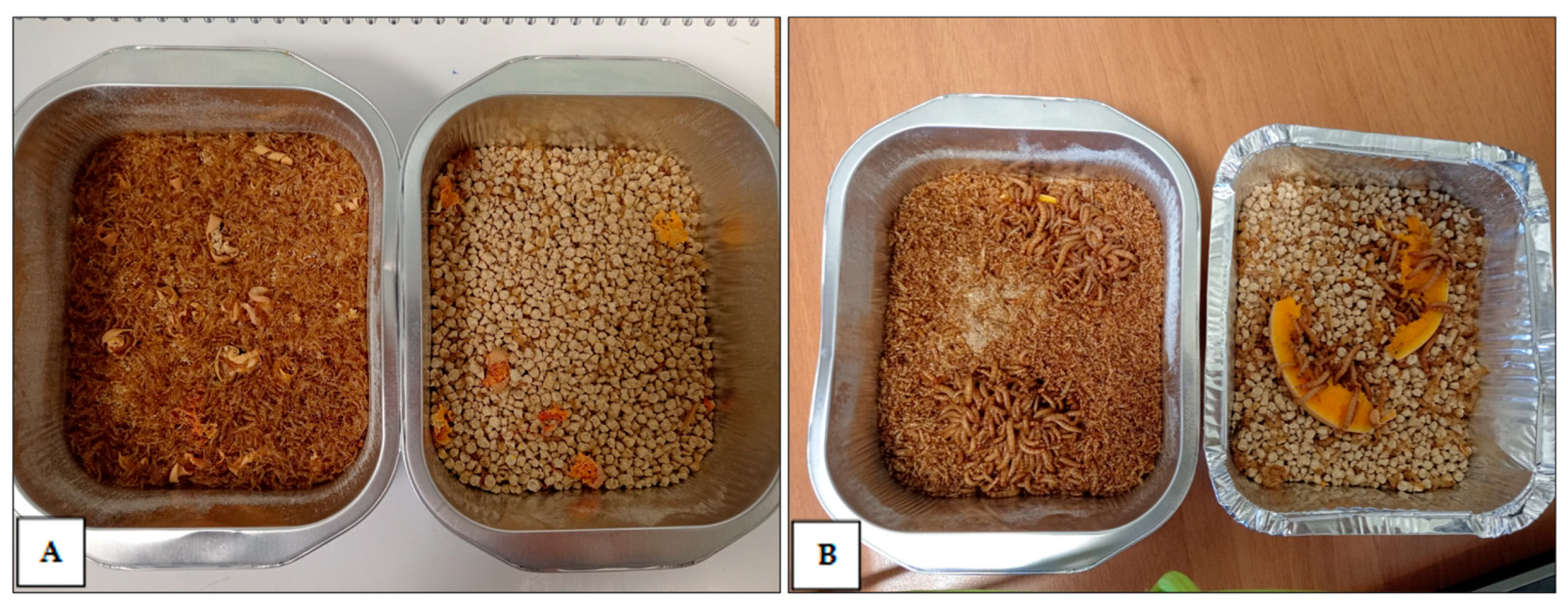 26]. However, self-selection also represents a potential methodological limitation when evaluating mixed diets provided ad libitum in bulk form. On the contrary, the administration of new assembled diets reduces self-selection and facilitates the separation of frass and unconsumed feed, which is essential for accurately calculating of diet efficiency indices [