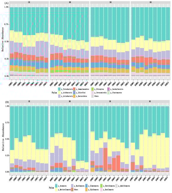 Soil microorganisms contribute significantly to nutrient cycling and the maintenance of soil structure, and their diversity serves as a sensitive indicator reflecting subtle alterations in soil quality []. Alterations in soil physicochemical conditions can either beneficially or detrimentally influence the structure and functions of soil microbial communities by changing their habitats []. The preponderance of scientific studies concur that SR and BR enhance the efficacy of soil microbiota in terms of their activity and diversity [,,,]. However, some studies have also shown that BR reduces the richness and diversity of bacterial and fungal communities [,]. The influence of biochar on soil physicochemical conditions, including pH, water retention, and nutrient provision, is regarded as paramount in affecting microbial communities []. Given that fungi typically thrive in lower pH environments, a pH increase induced by biochar might prioritize bacterial over fungal growth, particularly in the immediate vicinity of the biochar particle following its application []. However, long-term or excessive application of biochar makes the soil bacterial community structure develop in a specific direction, and finally leads to the decline of its diversity and abundance [,]. In addition, previous studies have shown that SR can enhance the stability of soil bacterial communities [,]. Similarly, BR has been shown to exert a positive influence on the stability of soil bacterial and fungal communities [,]. Currently, limited studies revealed that the combined straw and biochar application (BS) could promote SOC sequestration and mitigate C loss, yet there are marked differences in the C sequestration between SR and BR [,,]. However, there are limited studies on the effects of BS on soil microbial community structure and function.