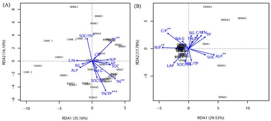 Redundancy analysis of the bacterial (A) and fungal (B) communities varies with environmental variables. CK: without biochar application or straw return; BR: biochar application of 30 t ha−1; SR: straw return of 5 t ha−1 year−1; BS: combined application of biochar (30 t ha−1) and straw (5 t ha−1 year−1); ME: mega-aggregates (>2 mm); MA: macroaggregates (0.25–2 mm); MI: microaggregates (<0.25 mm). ** p < 0.01; *** p < 0.001. βG: β-1,4-glucosidase; NAG: N-1,4-acetylglucosaminidase; LAP: leucine amino peptidase; ALP: alkaline phosphatase; SOC: soil organic carbon; TN: total nitrogen; TP: total phosphorus; C/N: βG/(NAG + LAP); C/P: βG/ALP; N/P: (NAG + LAP)/ALP.