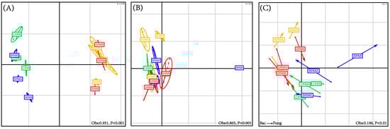 The BCA was performed to check for dissimilarities in the soil microbial community. The composition of the bacterial and fungal communities varied significantly and explained 95.1% (p < 0.001) and 86.5% (p < 0.001) of the total variation, respectively (Figure 4A,B). The ellipses depicting the bacterial community composition of the SR and BS treatments were distinctly separated from those representing the CK and BR treatments (p < 0.001, Figure 4A). The ellipses denoting the bacterial community composition of the BR treatment were distinctly separated from those of the CK treatment across three aggregate fractions (p < 0.001, Figure 4A). The ellipses illustrating the fungal community composition of the BR and BS treatments were notably separated from those of the CK and SR treatments in MA and MI (p < 0.001, Figure 4B). The ellipses representing the fungal community composition of the SR treatment was distinctly separated from that of the CK treatment in MA (p < 0.001, Figure 4B). In addition, the ellipses depicting the microbial community composition of MI were distinctly separated from those of ME and MA (p < 0.001, Figure 4A,B).