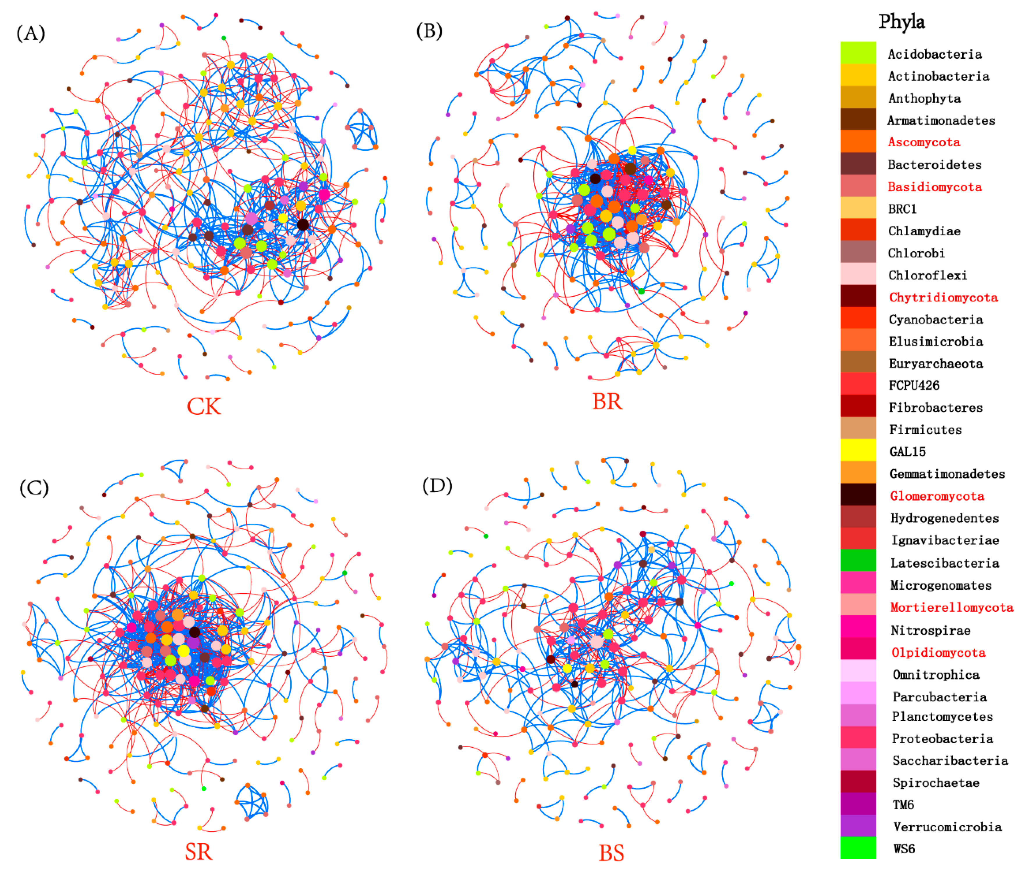 4.4. Straw-Returning Method and Aggregate Fraction Affect the Interaction of Microbial Community