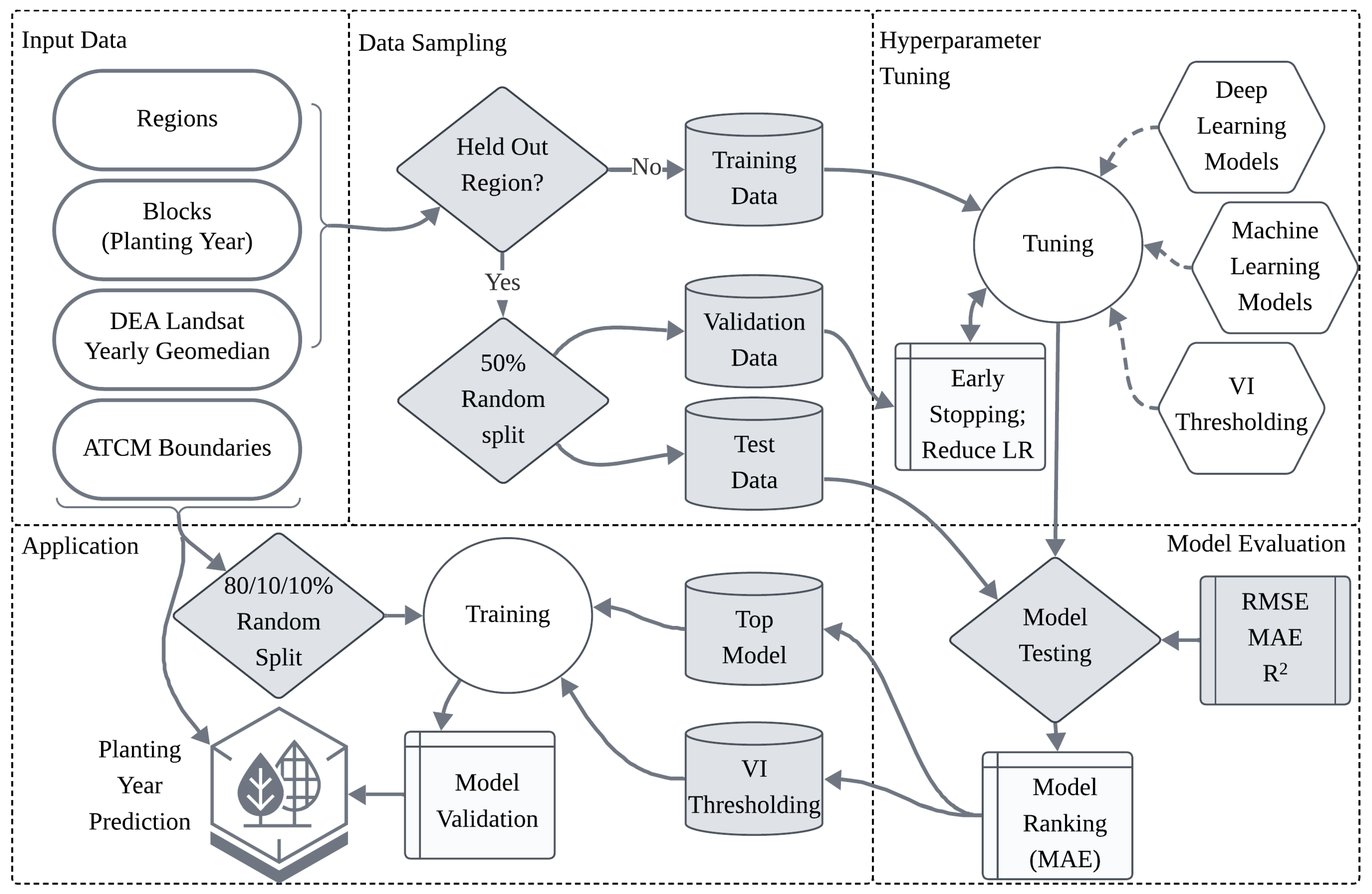 In this study, multiple machine learning models were developed and evaluated to predict crop planting years from multi-temporal satellite imagery. The methodology included data preparation, hyperparameter tuning, model training, evaluation, and comparative analysis of model configurations. The top-performing models were subsequently applied to the Australian Tree Crop Map (ATCM) [