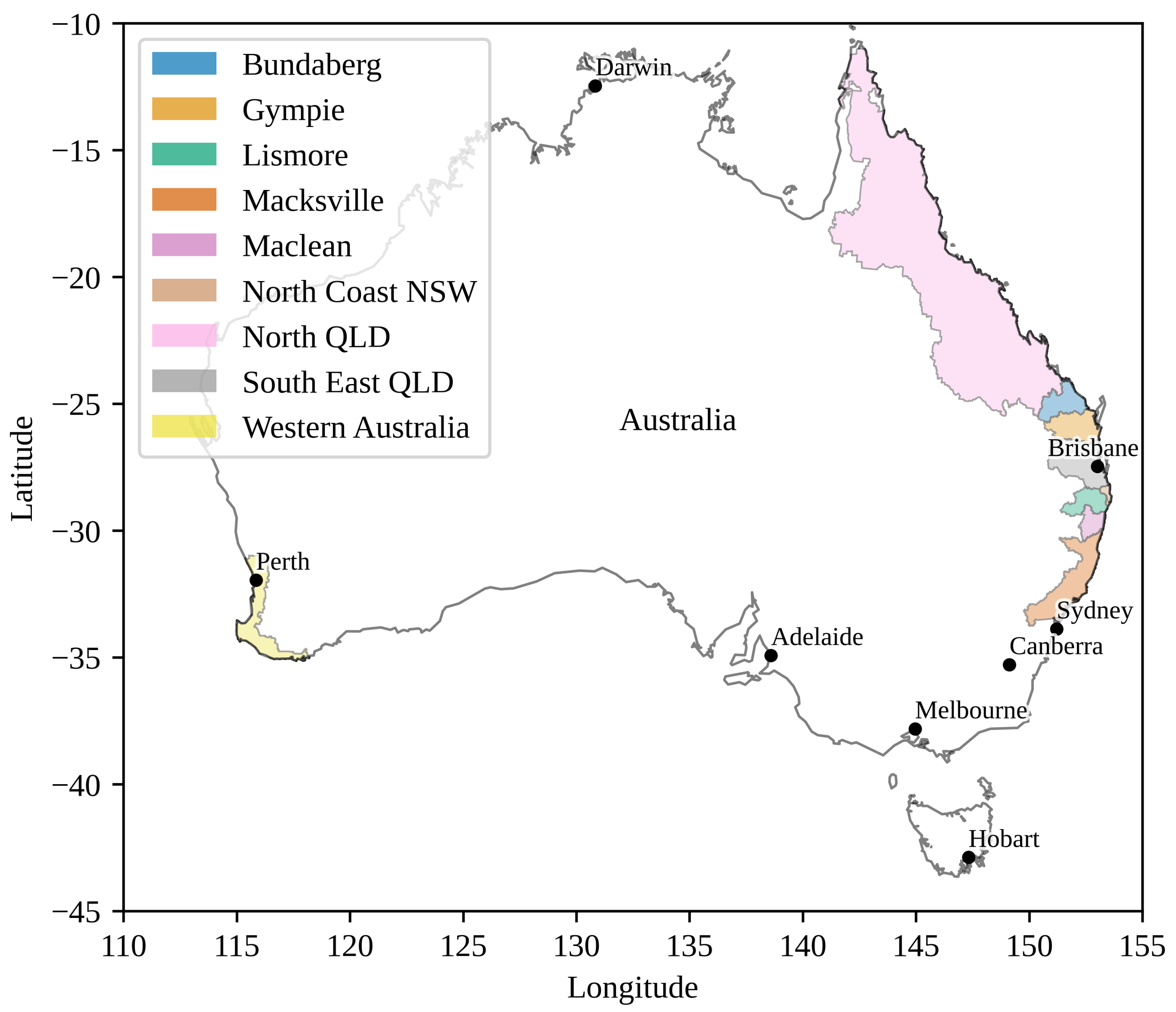 The study area encompassed all macadamia orchards defined by ATCM, from Tropical Queensland to New South Wales Mid North Coast in the east and South West Western Australia (