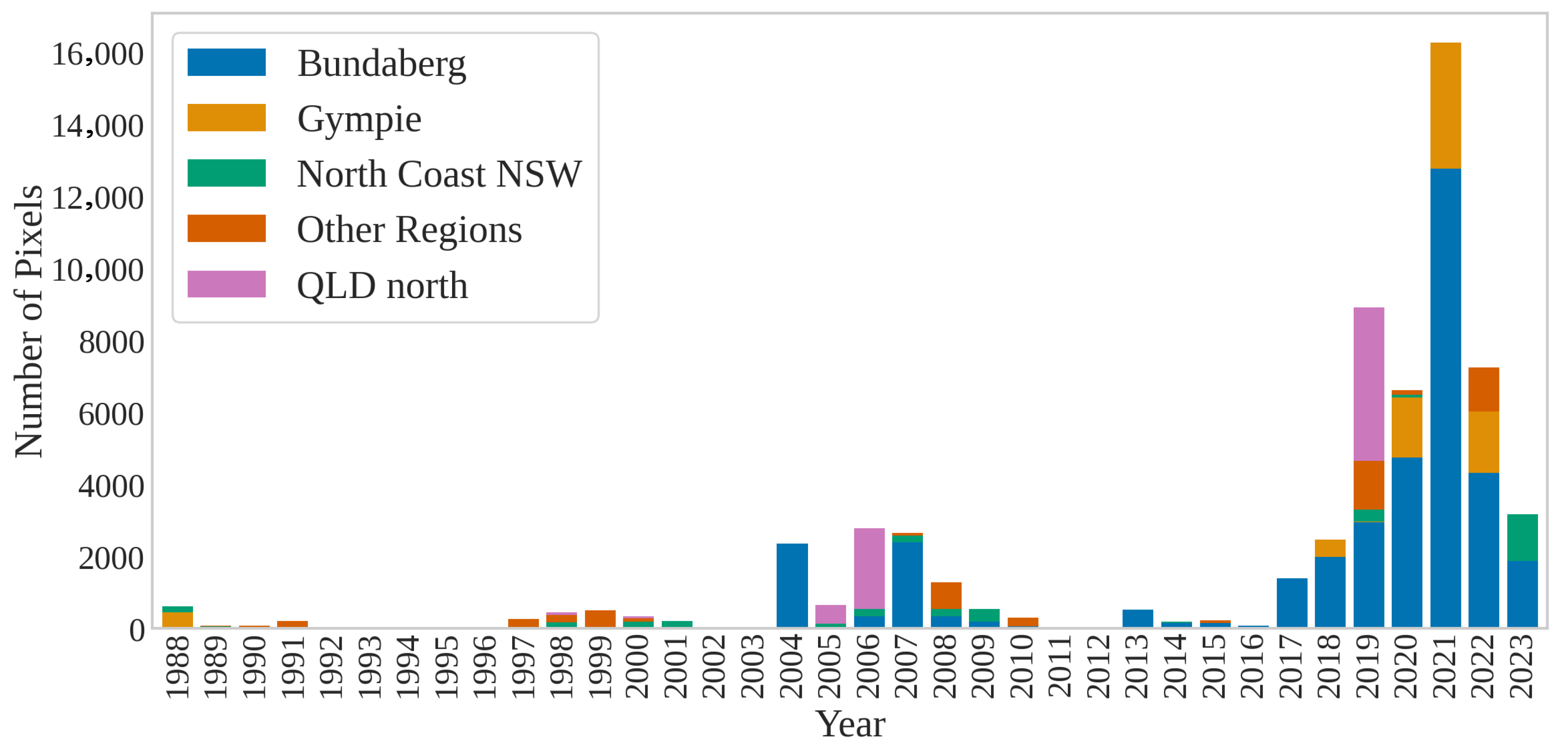 24]. To ensure adequate data coverage while limiting regional imbalance, regions with fewer than 3000 pixels (Lismore, Macksville, Maclean, South East Queensland, and Western Australia) were grouped into an “Other Regions” category for modelling.