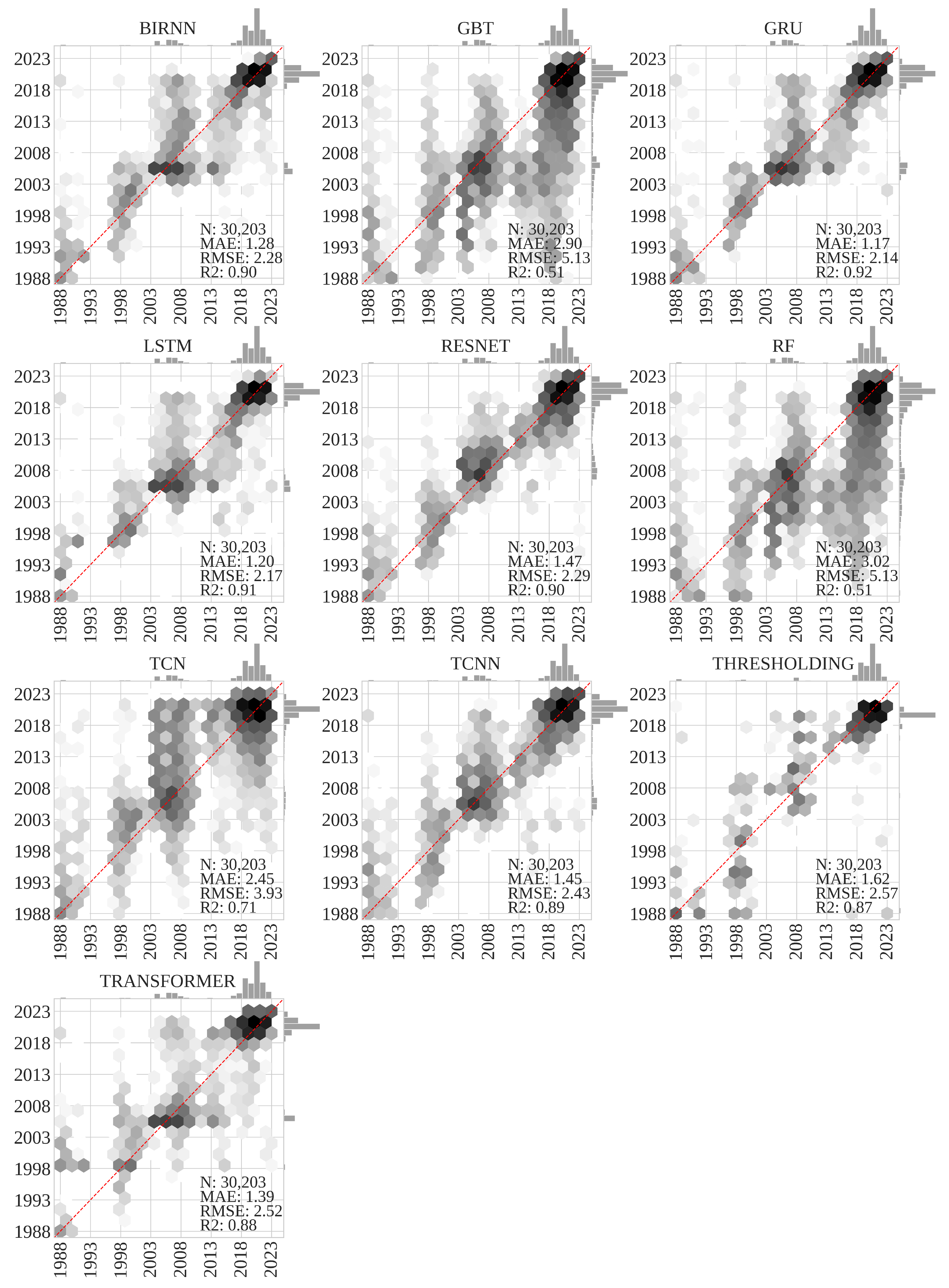 The thresholding approach, which relied on identifying specific GNDVI values to determine orchard age, performed remarkably well. This simple approach proved effective for detecting orchards within an age range (>3 years), particularly when strong spectral signals were present. Nonetheless, it is inherently limited in its ability to generalise across diverse planting scenarios or account for more subtle temporal changes. In contrast, deep learning models utilised multi-year spectral patterns and temporal context. This suggests that deep learning models may accurately determine orchard age and planting year, even in cases where complex or subtle temporal dynamics were involved. Tree-based methods like RF and GBT offered moderate performance but were inherently constrained by their inability to model temporal dependencies effectively for this type of application.