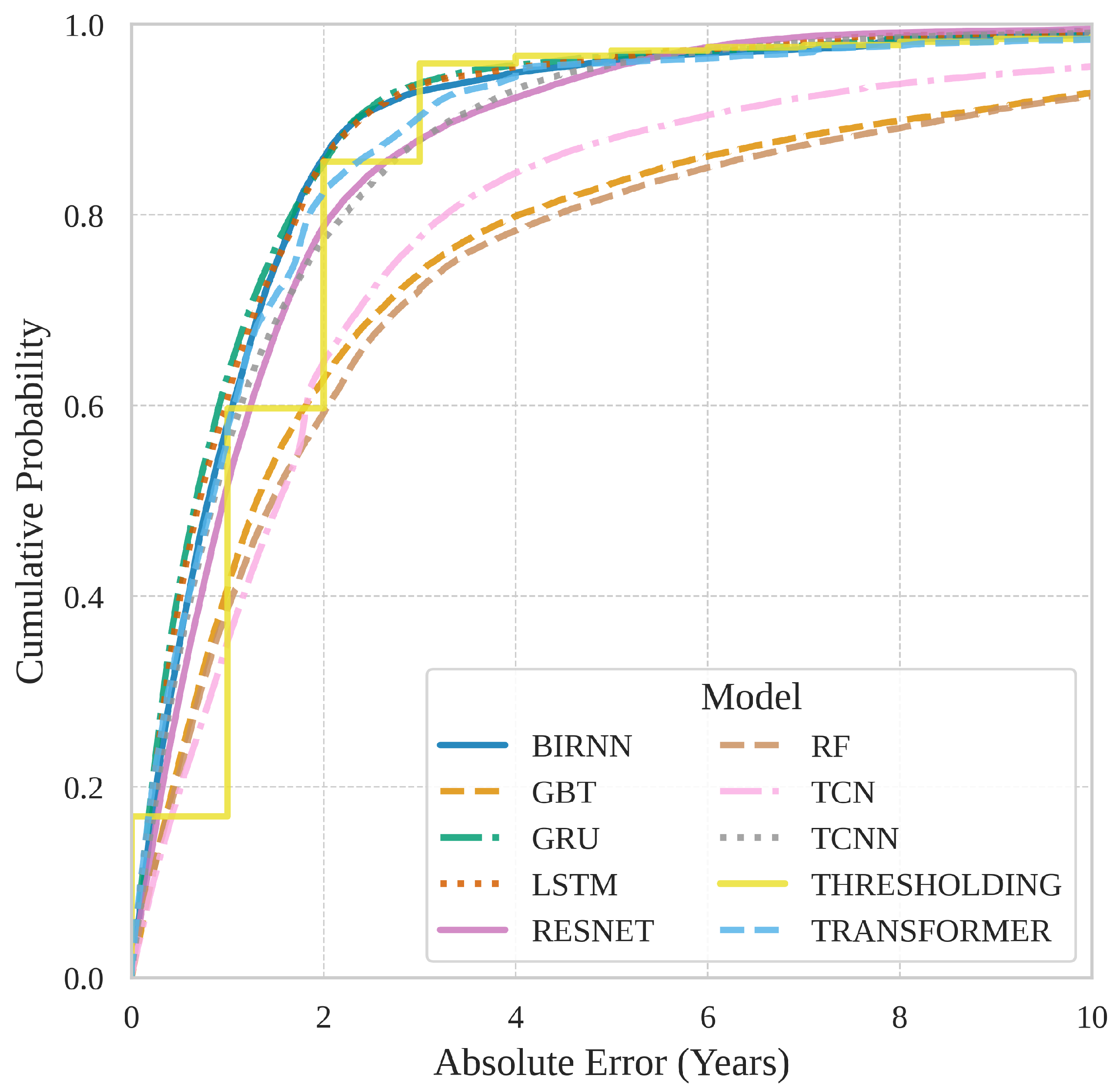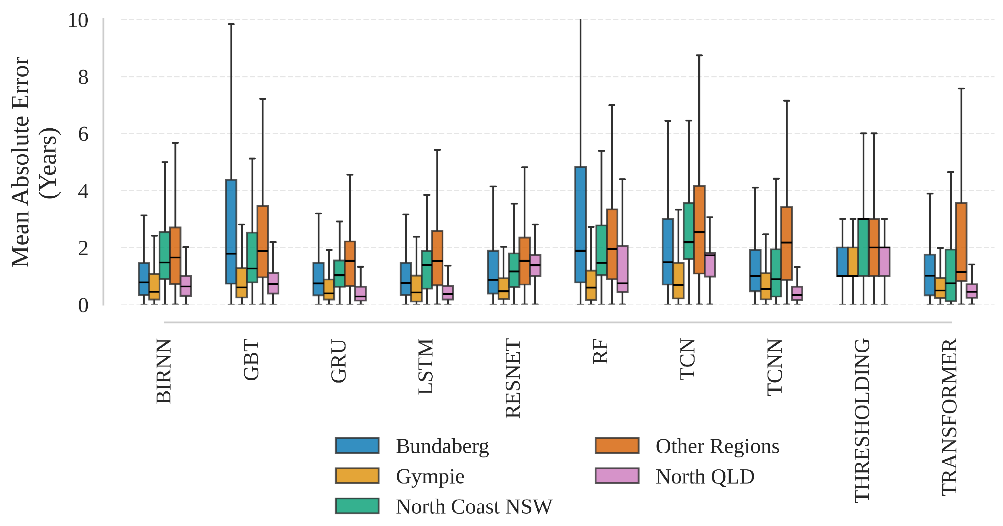 38]. Across regions held out entirely for testing (LOROCV), all deep models achieved MAE < 1.5 years except TCN (