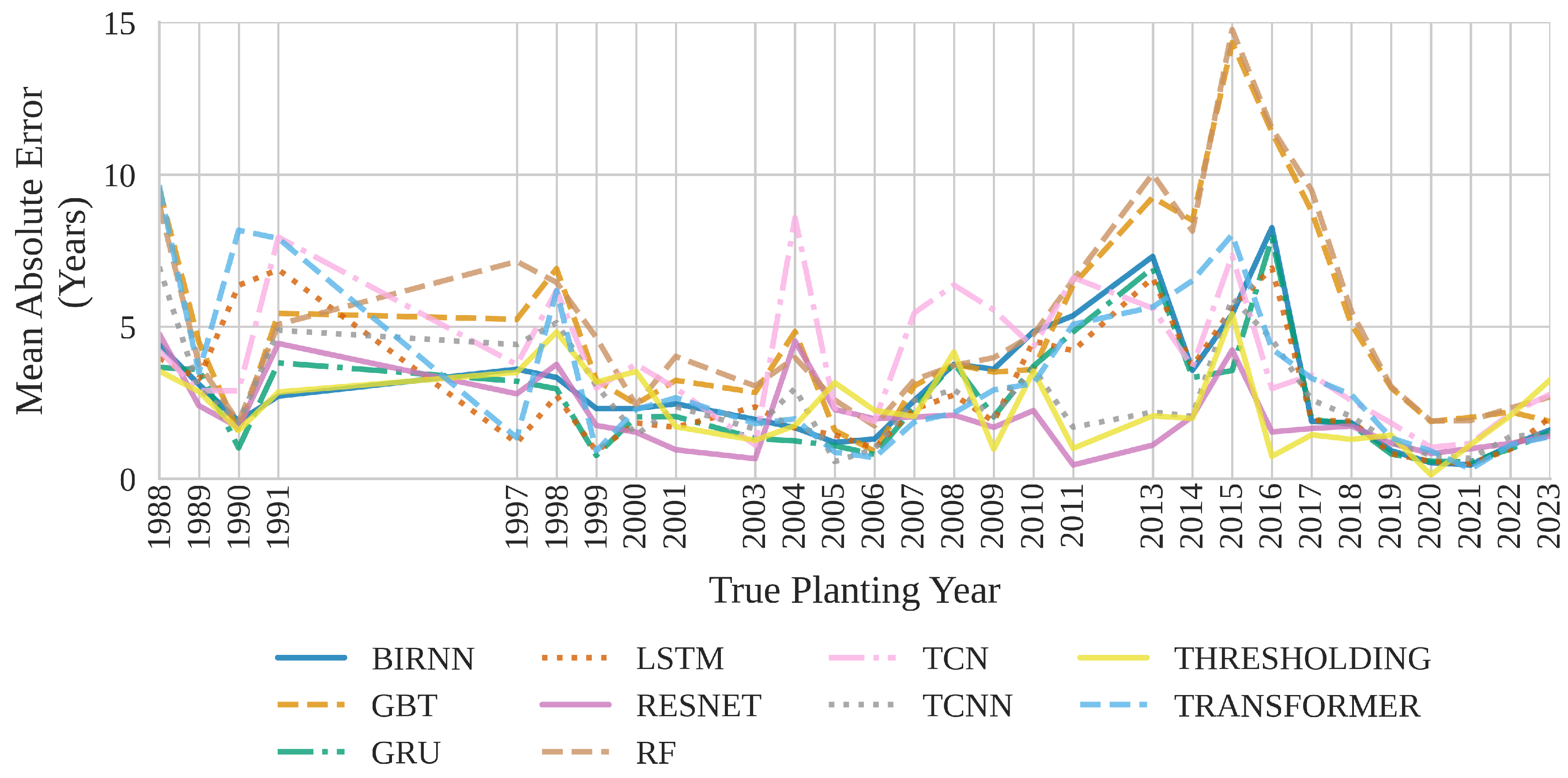 Figure 3) creates a temporal imbalance: MAE is lower in these well-sampled periods and higher for planting years with sparse data (