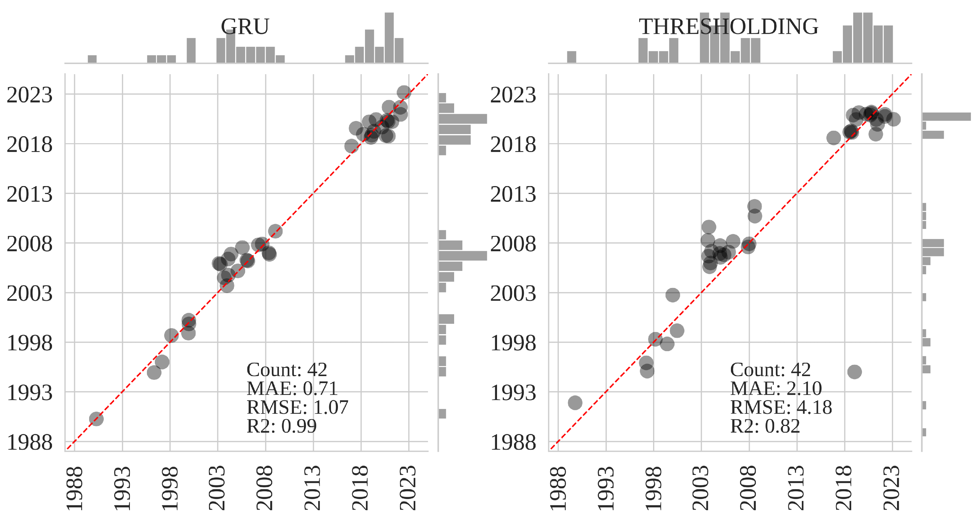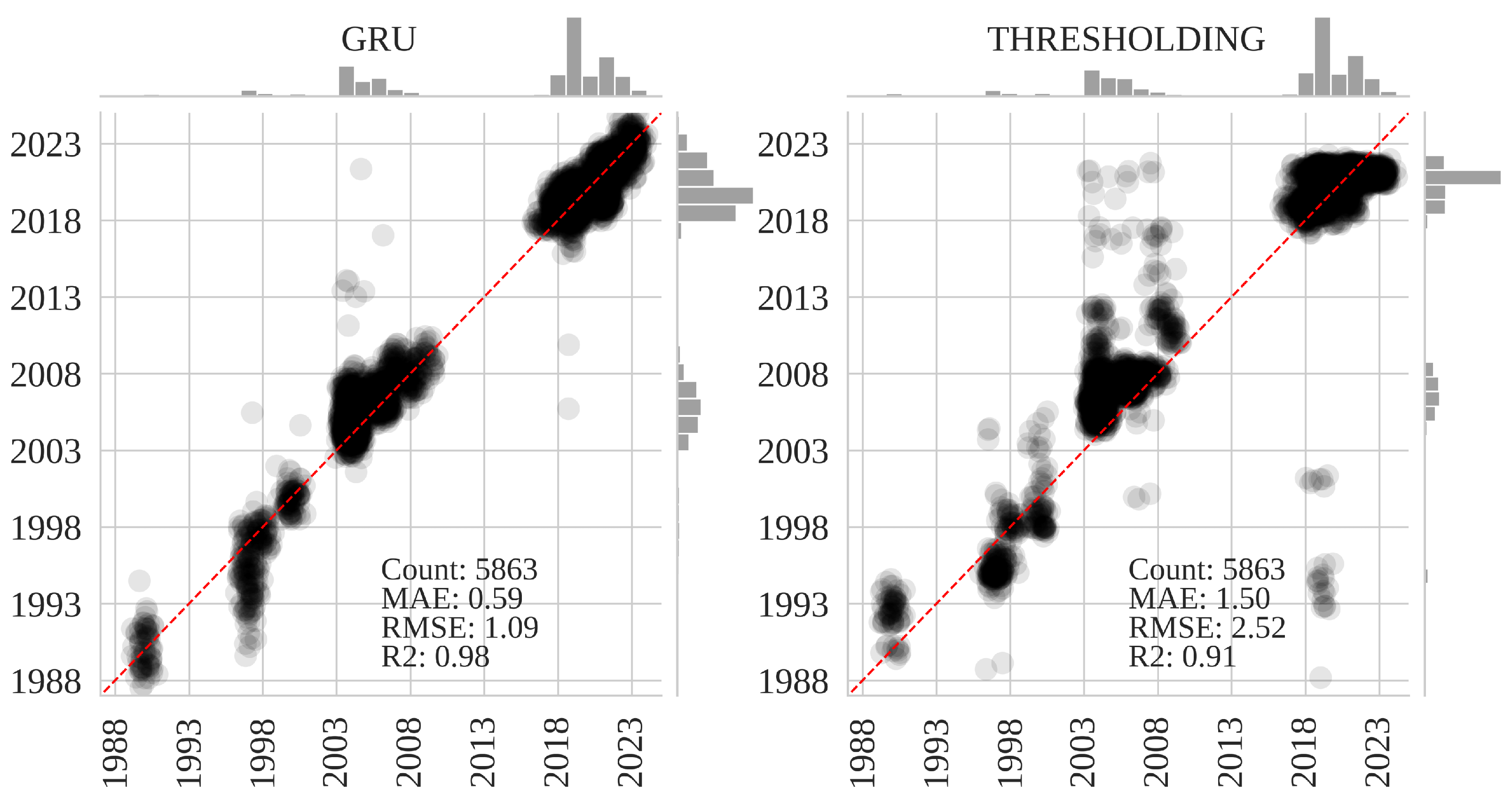 Figure 8 compares the GRU model against the threshold-based method initially described by Brinkhoff & Robson [