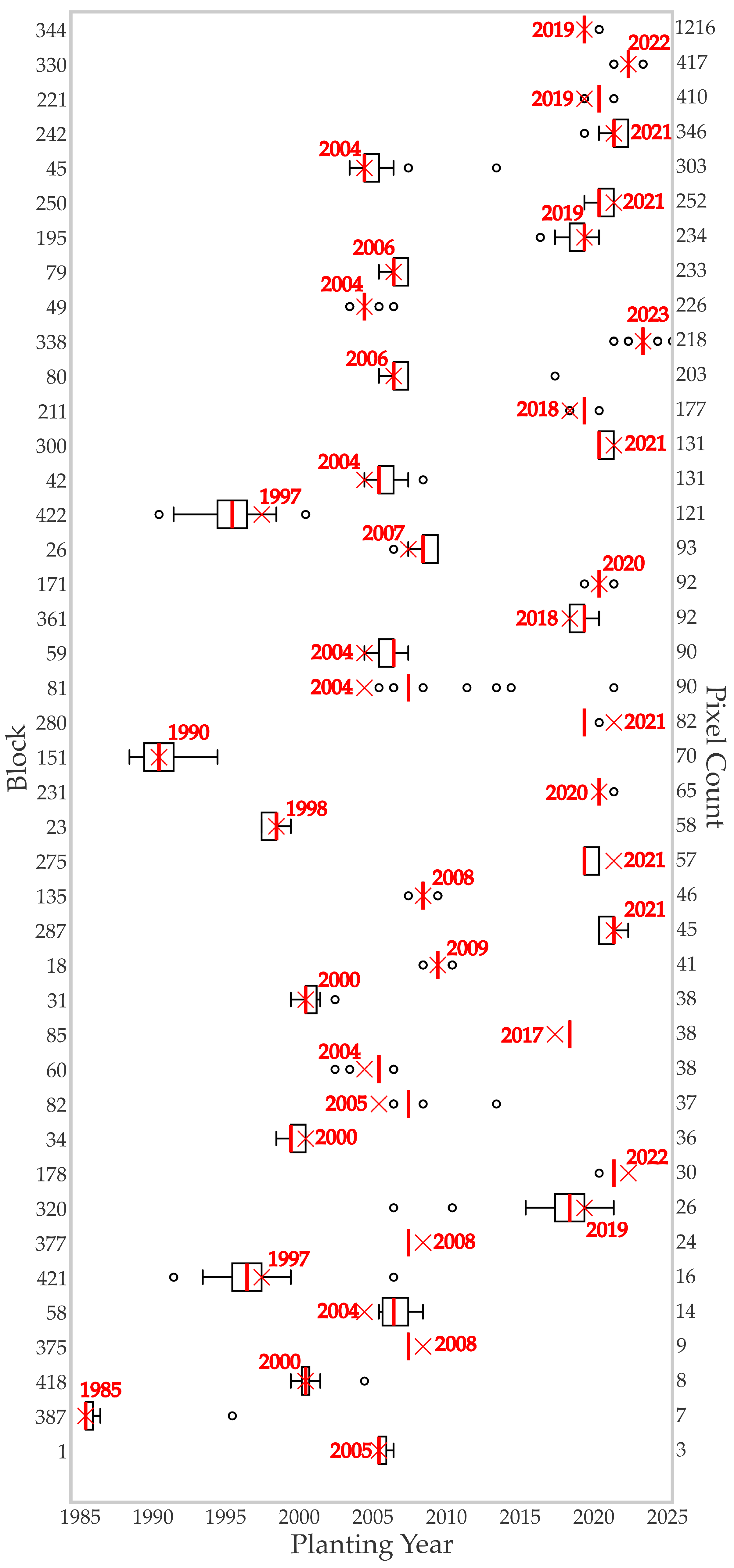 8], planting year estimation was performed at the pixel level to retain sub-orchard heterogeneity within the mapped extent, acknowledging that polygon boundaries may not coincide exactly with management units.