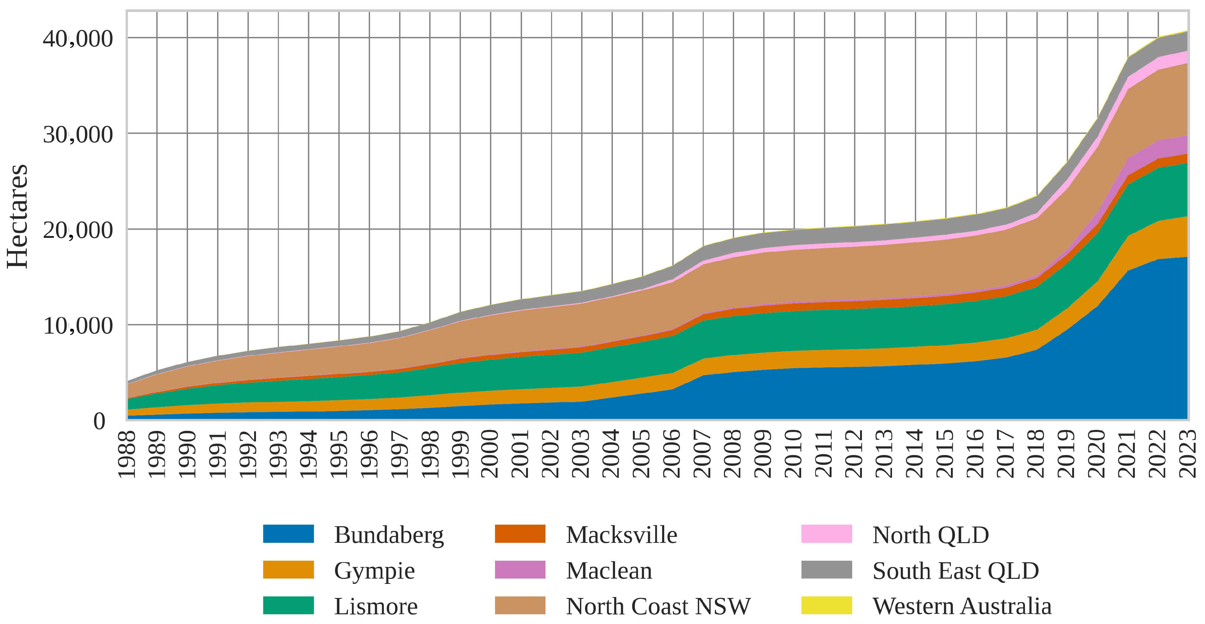 Figure 11) indicates substantial increases in planting areas across all regions in recent years (2018–2023), especially in the Bundaberg and Gympie growing regions. However, it is important to note that this analysis only considers macadamia orchards represented in the ATCM. Macadamia blocks that have been removed over time are not accounted for in the plot, meaning the cumulative areas shown do not reflect historical orchards that were planted and subsequently removed. This omission potentially leads to an underestimation of total planting activity over the years if used in this way.