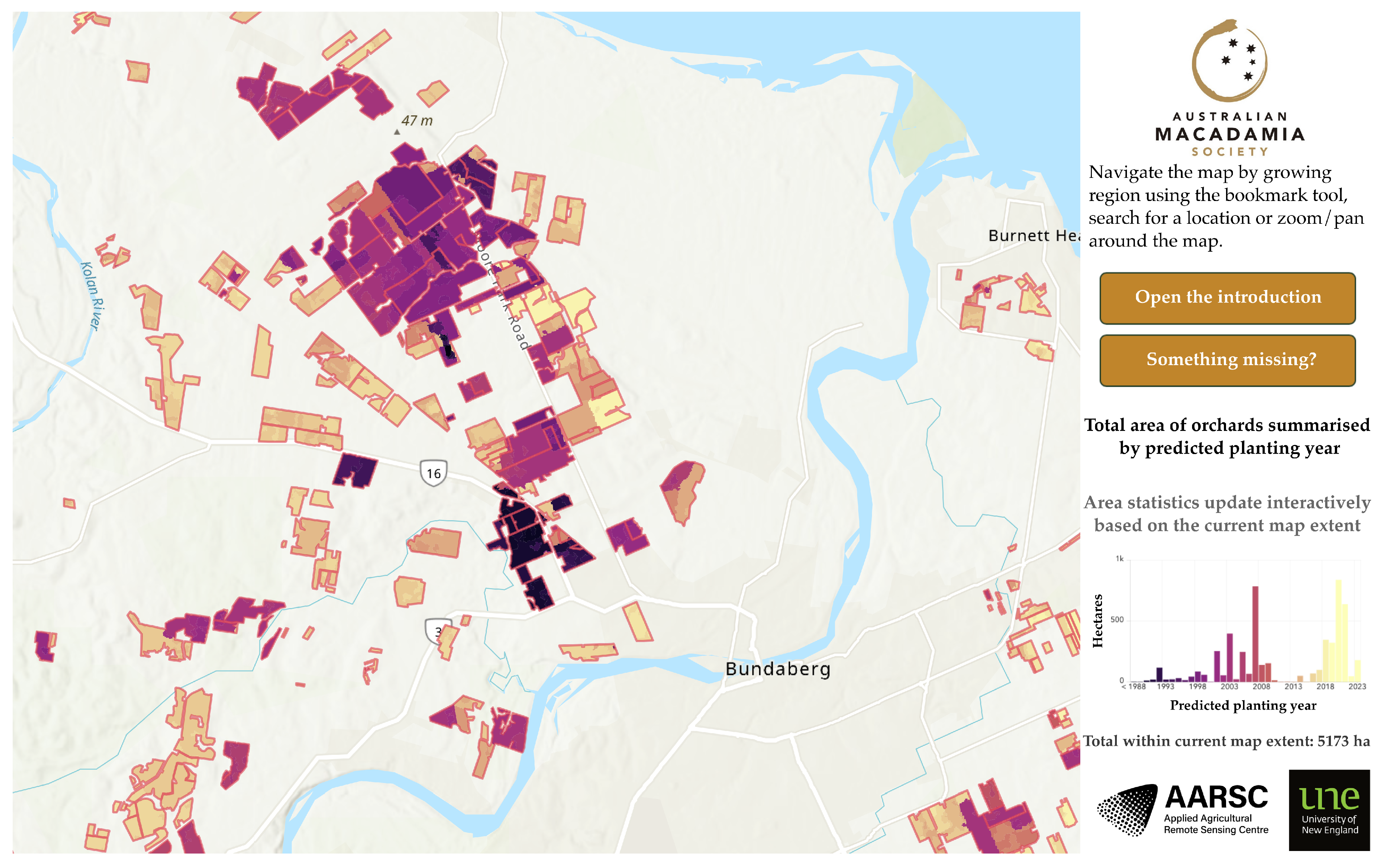 The predictive models developed in this study offer significant potential for enhancing agricultural planning, yield forecasting, and informed decision-making within the macadamia industry. Accurate orchard age information is invaluable for optimising resource allocation, pest and disease control, harvest and processing scheduling/planning. The integration of these insights into a dashboard-style mapping application shared with industry stakeholders provides a practical tool for real-world applications, facilitating ongoing collaboration and data expansion.