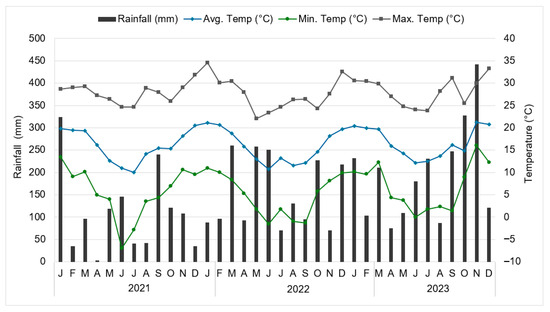 Rainfall (mm), average temperature (Avg. Temp; °C), minimum temperature (Min. Temp; °C), and maximum temperature (Max. Temp; °C) recorded in the municipality of Lages/SC, Brazil, from January 2021 to December 2023.