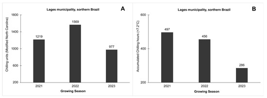 According to meteorological data collected in the municipality of Lages, SC, from January 2021 to September 2023 (Figure 1), notable climatic differences were observed between the 2021–2022 and 2022–2023 growing seasons, particularly during the critical stages of “Leticia” plum development. During the winter dormancy period (April to August), the 2022 growing season showed lower average temperatures and a greater number of days with minimum temperatures below 7.2 °C compared to 2021 growing season. As illustrated in Figure 2, both chilling hours and chill units were higher in 2022 growing season, indicating a colder and more prolonged chilling period.