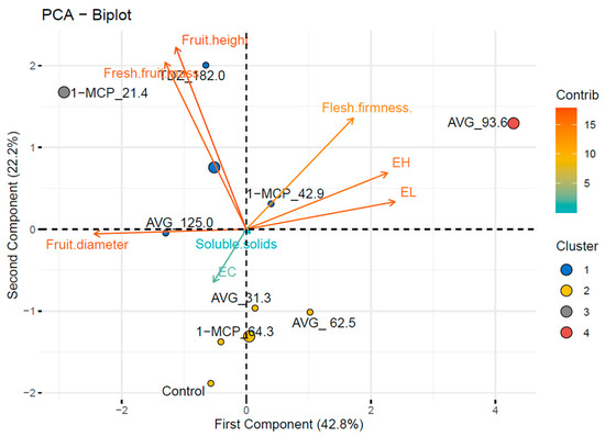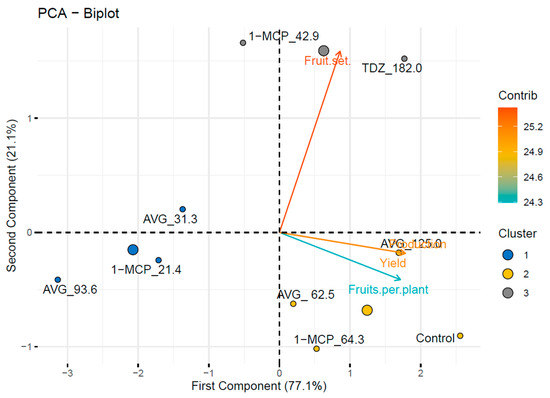 The multivariate analyses using Principal Component Analysis (PCA) and k-means clustering provided an integrated understanding of the combined effects of AVG, 1-MCP, and TDZ on fruit set, yield performance, and fruit quality parameters. PCA was applied to reduce the dimensionality of the dataset and to identify the principal components that explained most of the variance among treatments, while k-means clustering grouped treatments with similar multivariate response patterns. The first two principal components (PC1 and PC2) explained 68.2% of the total variance, showing that TDZ was more associated with yield performance traits, whereas AVG and 1-MCP were linked to higher fruit retention and improved quality parameters. Treatments that clustered closely together exhibited similar physiological behavior, confirming the complementary effects of these PGRs under the edaphoclimatic conditions of southern Brazil.
