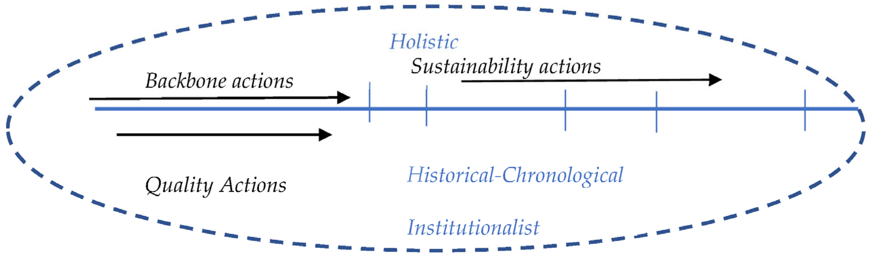 Holistic analysis studies change processes by considering all elements and their interrelationships, rather than individual parts. In this sense, the comprehensive analysis that is proposed considers aspects related to production and positioning in the value chain. These include questions around productive structure (cooperativism and associations); environmental sustainability (organic production, integrated production, soil management, and use of cover crops, waste management); and quality (total quality; PDO quality certification). Through institutional analysis, regulations, and financial support, promote changes to foster a sustainable and high-quality primary and industrial production model (of olives and oil). Institutional analysis allows for the identification of explicit, synergistic, specific objectives with the desire to settle the population in the territory. The historical analysis exhibits the changes in chronological order. This explains the progressive efforts undertaken by producers in the region, genuinely pursuing price improvements that are compatible with social and environmentally sustainable development.