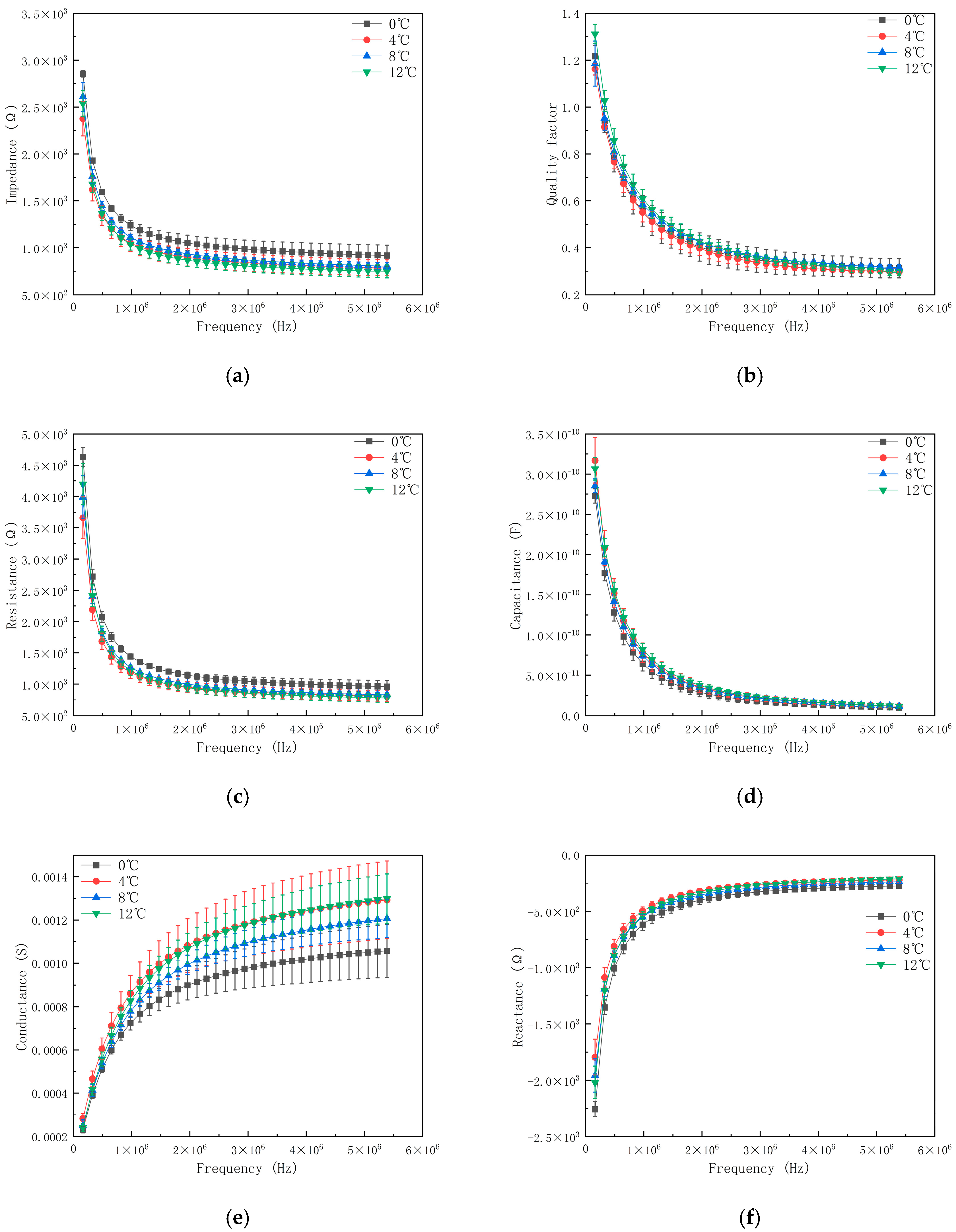 The variation in electrical parameters of fresh goji berries with frequency at different temperatures. (a) The change in impedance with frequency at different temperatures; (b) variation in quality factor with frequency at different temperatures; (c) the change in resistance with frequency at different temperatures; (d) the change in capacitance with frequency at different temperatures; (e) the change in conductance with frequency at different temperatures; (f) change in reactance with frequency at different temperatures. Each of the above points represents the average of three repeated experiments.