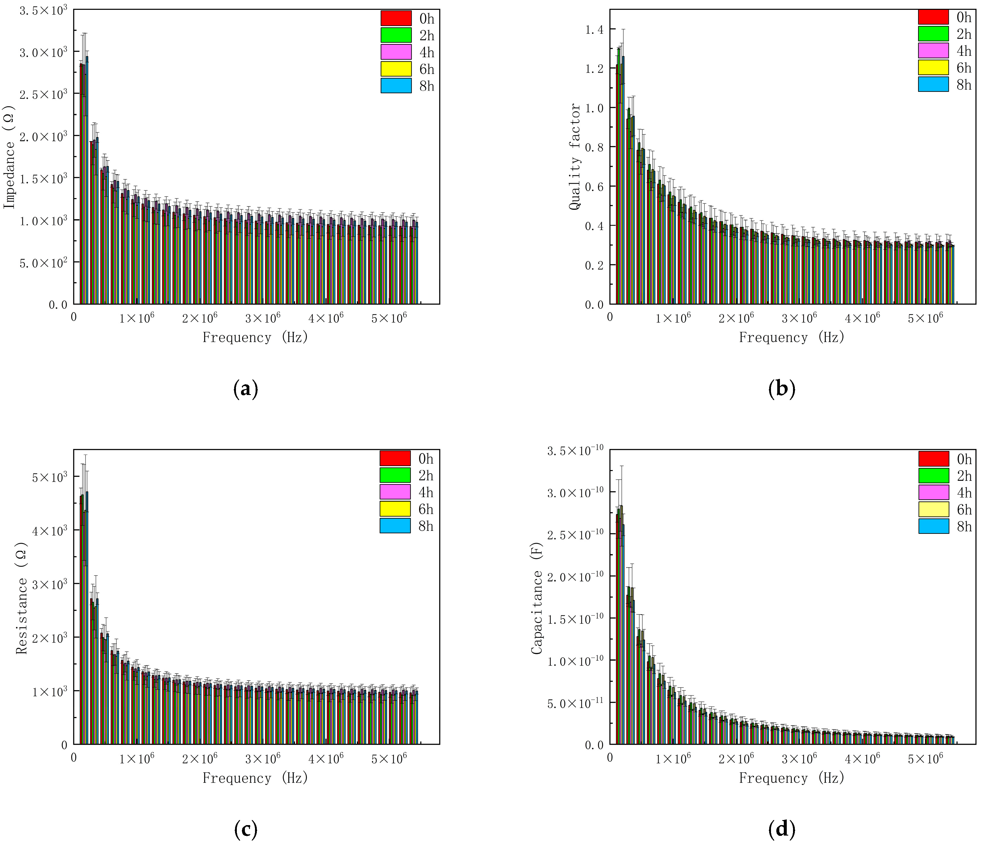 28]. When the sample preservation temperature was set to 0 °C, the preservation time to 0 h, and the specific test frequency to 163,280 Hz, the electrical parameters and quality characteristics are shown in