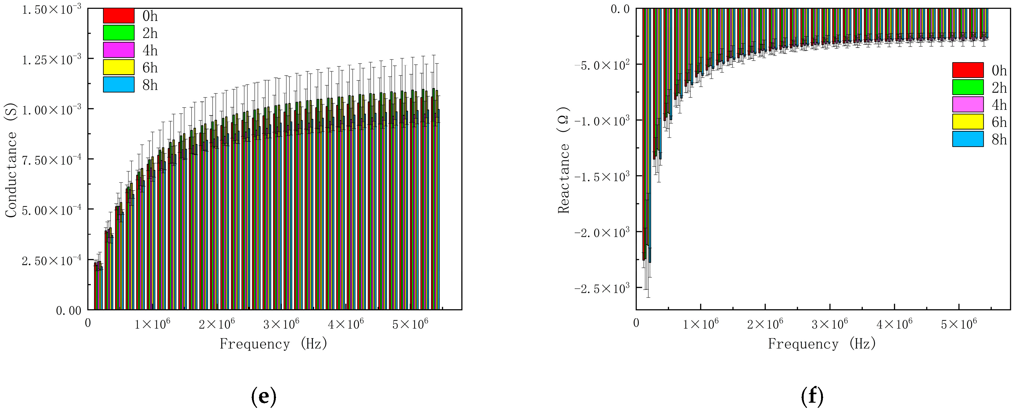 Figure 2e,f, the conductance (G) and reactance (X) of fresh goji berries both increased with frequency across the tested temperatures. Additionally, the change in reactance was diminished at higher frequencies. At a 0 °C storage temperature, G increased from 0.00023 S at 163,280 Hz to 0.00106 S at 5,387,800 Hz, representing a 360.86% increase. X decreased from −2256.53 Ω to −275.42 Ω, showing an 87.79% decrease.